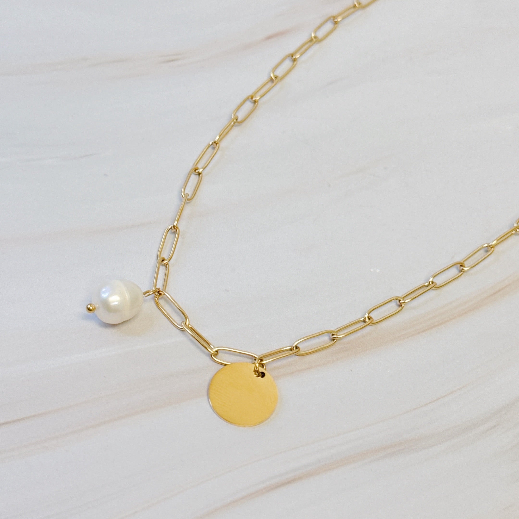This necklace boasts a beautiful freshwater pearl and a modern, chic disc design. It is the perfect combination of elegance and trendiness for any occasion. From formal events to everyday wear, this necklace is a must-have.