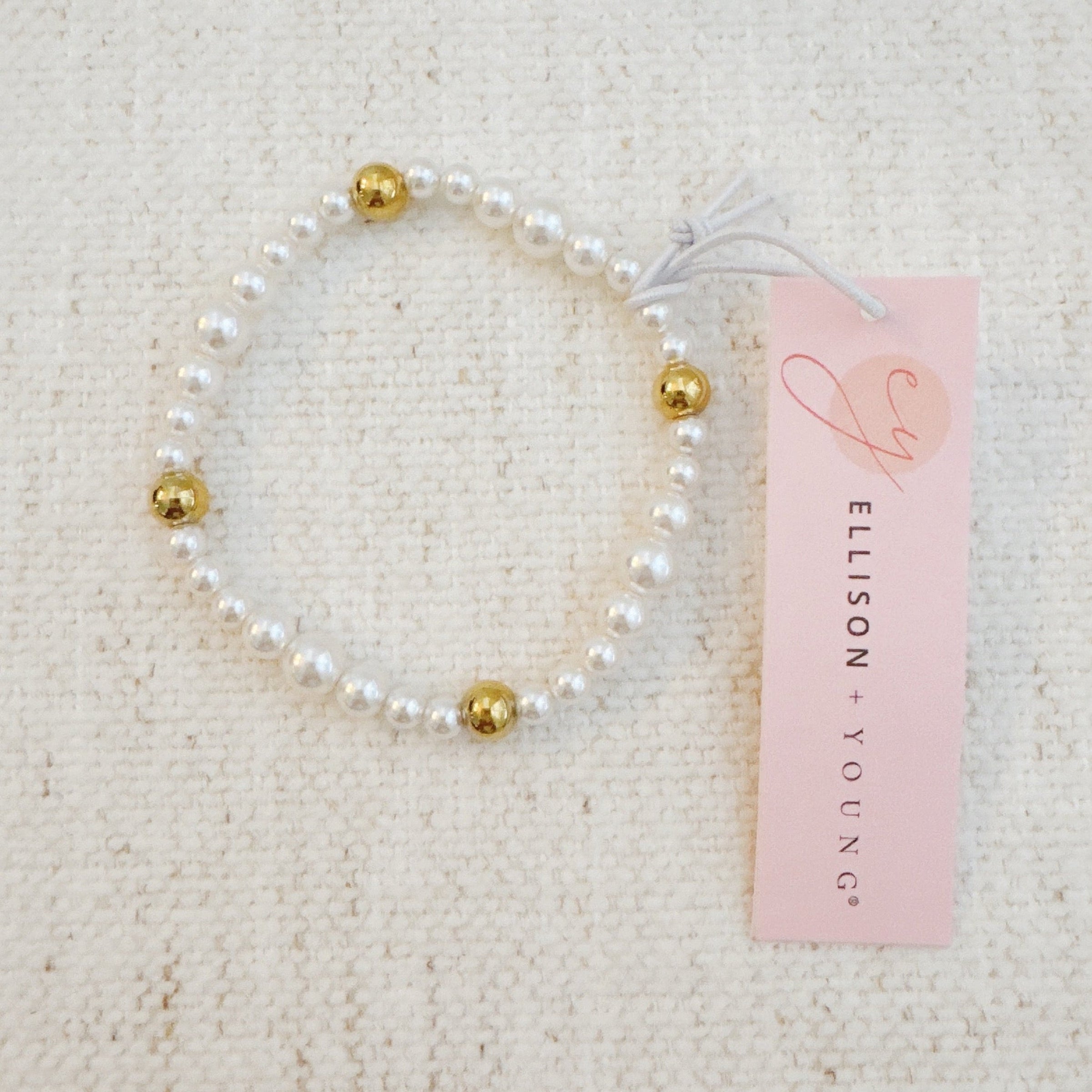Add a touch of timeless elegance with the Pearl & Gold Beaded Stretch Bracelet. This elegant piece features lovely pearls and gleaming gold beads, making it the perfect accessory to elevate any outfit. Ideal for any occasion, this bracelet is a timeless must-have.