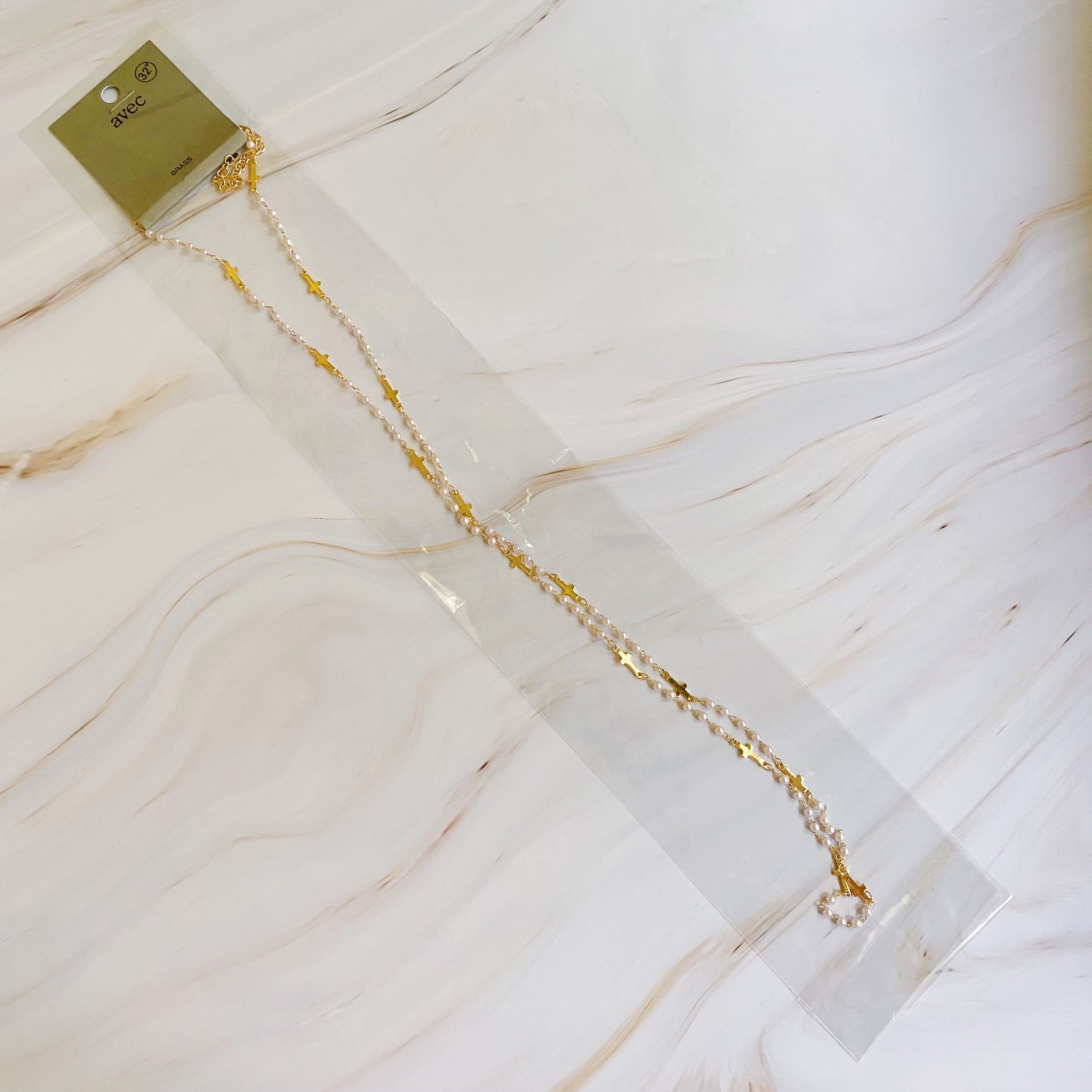 This Pearls And Crosses Long Necklace features a beautiful mix of tiny golden crosses and pearl bead chain. Its design allows for versatile styling options, such as doubling up the 32-inch chain for a choker effect, or wearing it long over a shirt or sweater. Its dainty details are sure to add a sophisticated finishing touch to any outfit.