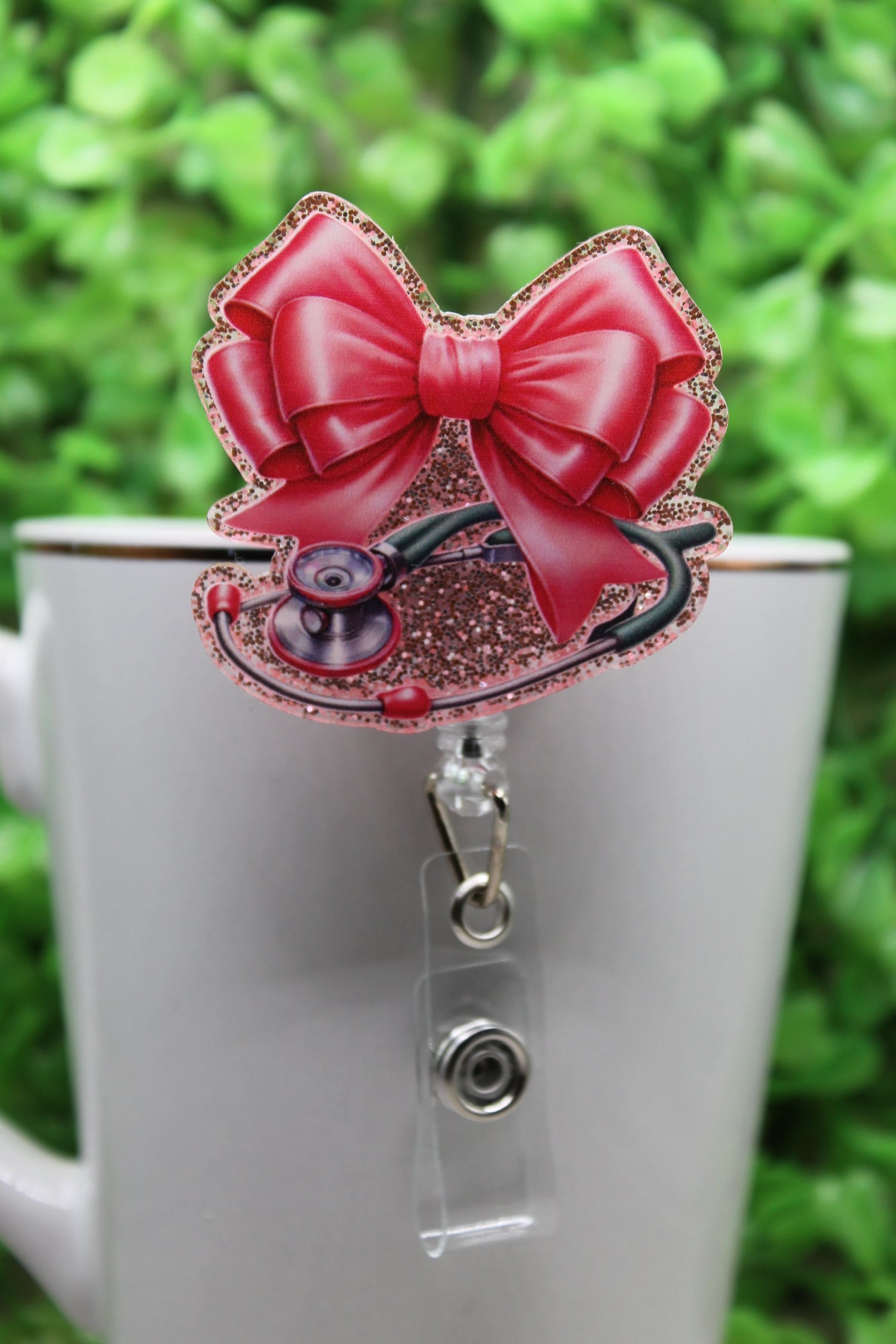 Pink Bow and Stethoscope on Glitter Badge/ID Holder Reel