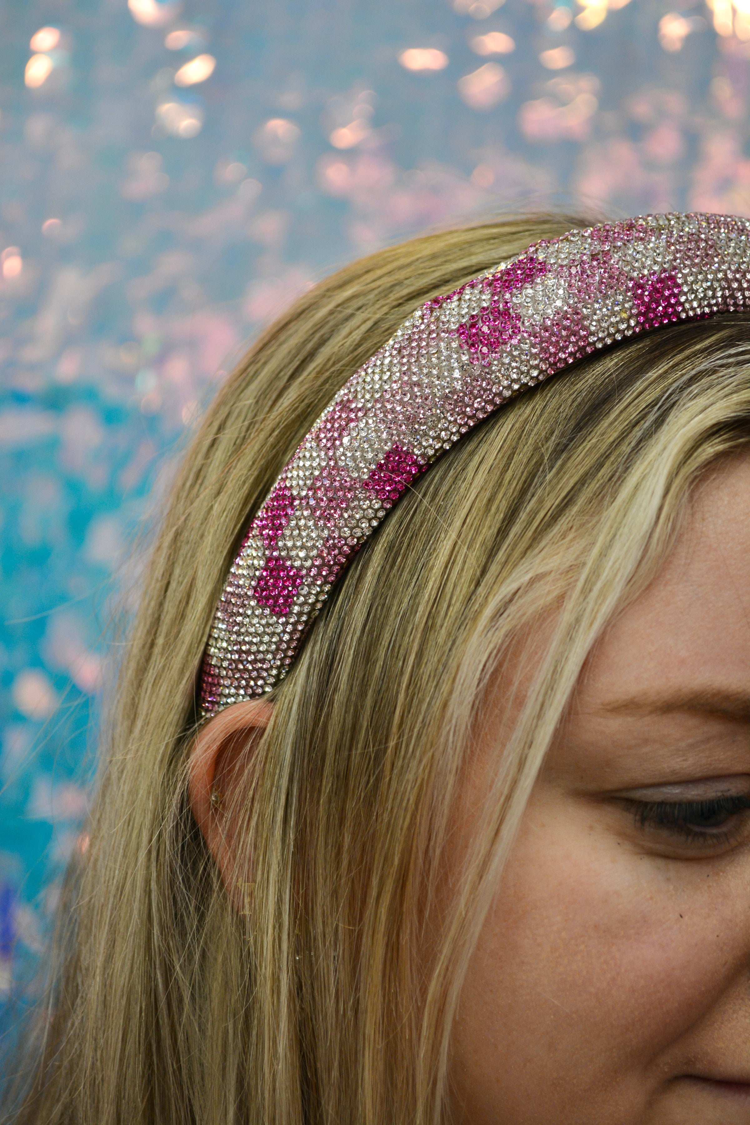 Add some sparkle and sass to your ensemble with this playful Pink Checkered Rhinestone Headband. Say goodbye to boring hair days and hello to head-turning style. Perfect for a touch of glam on any occasion!