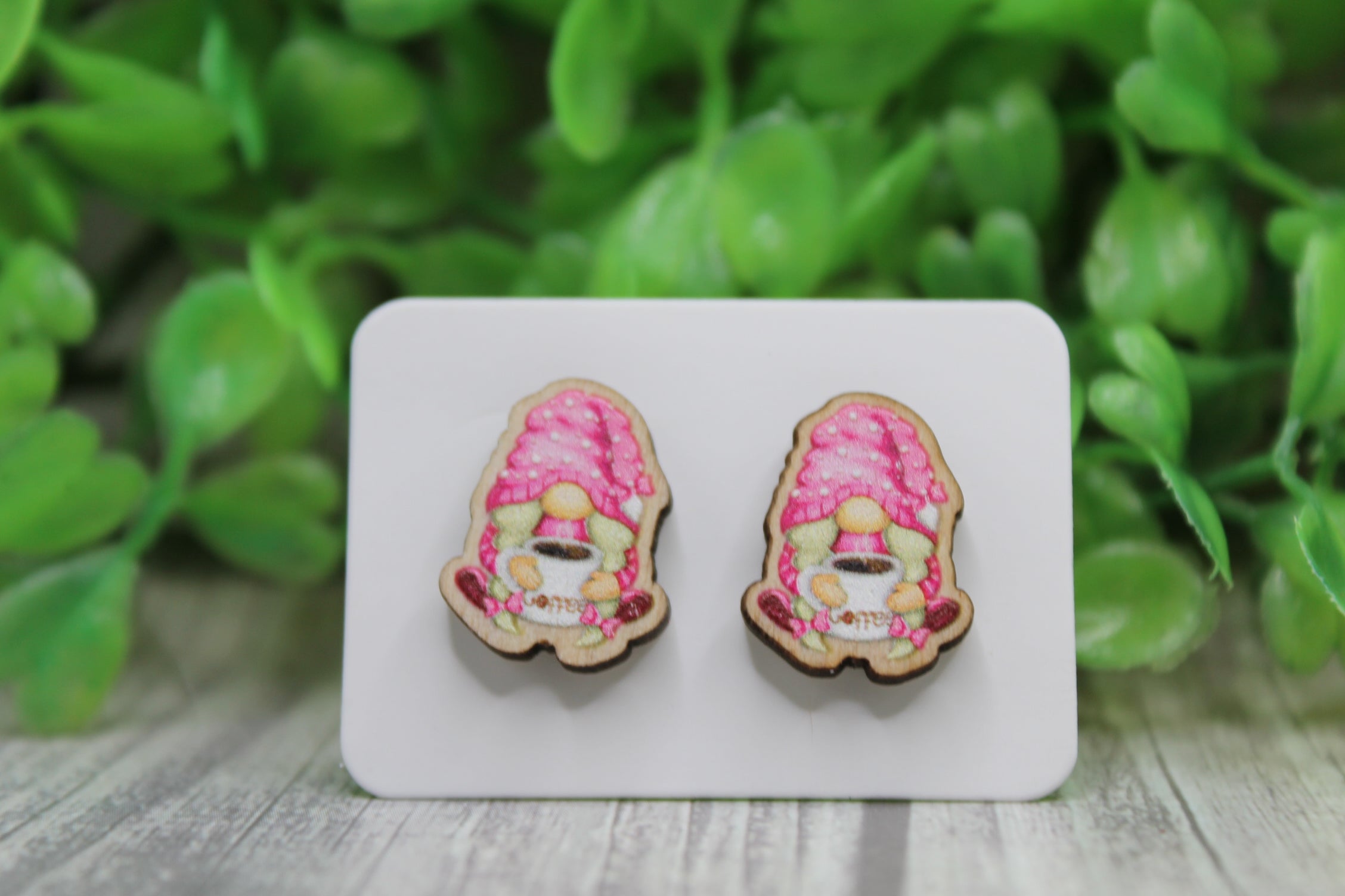 Pink Coffee Gnome Wood Stud Earrings