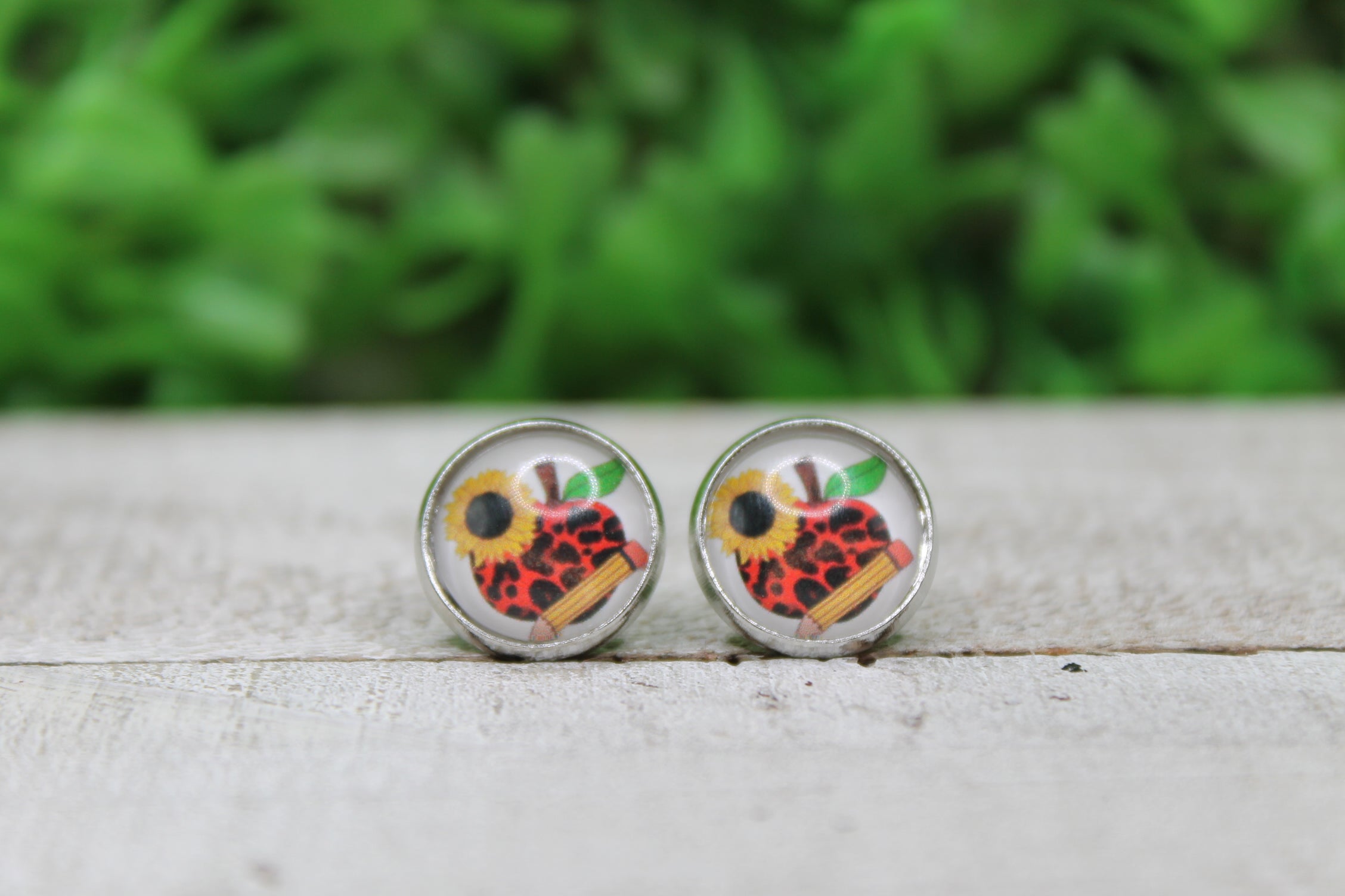 Red Leopard Apple with Sunflower & Pencil 12mm Glass Stud Earrings