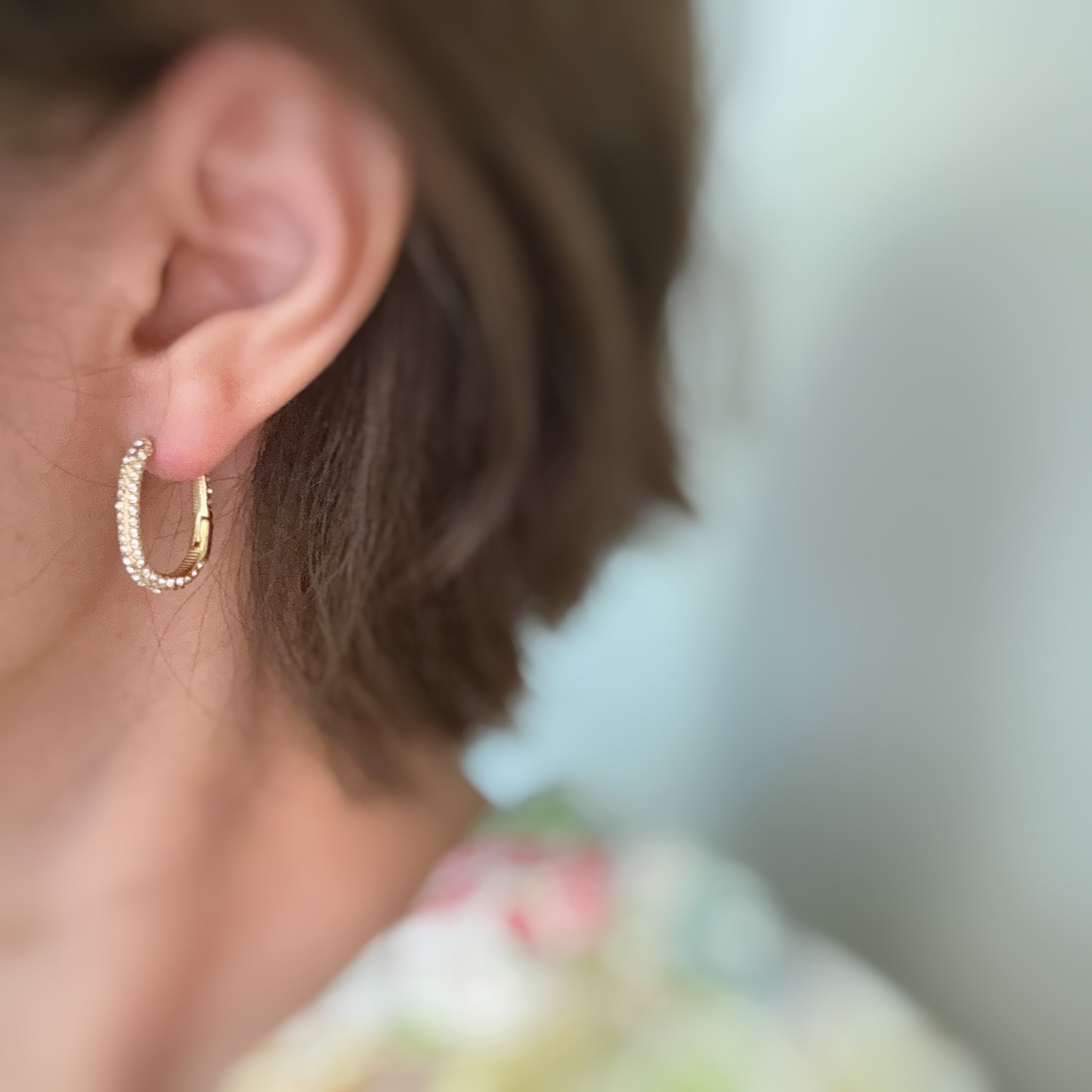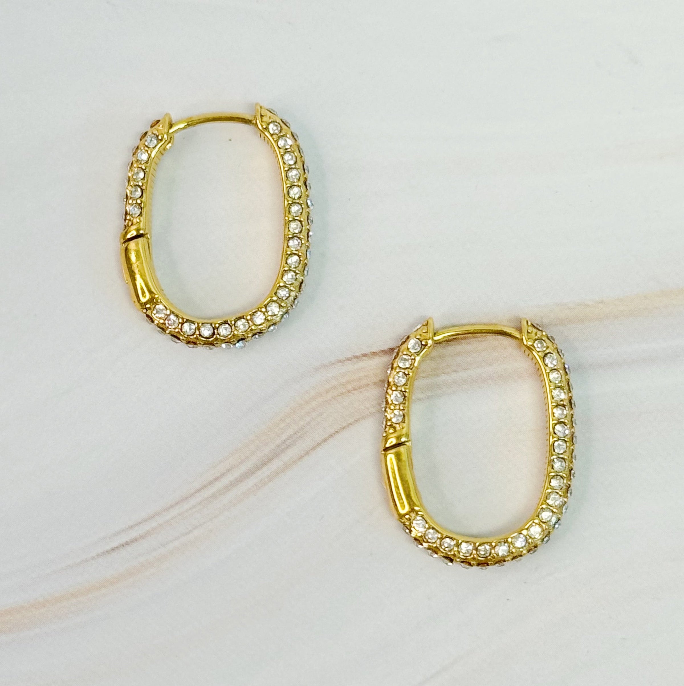 Introducing our sophisticated Shine Covered Oval Hoop Earrings. Their lovely oval shape adds a touch of elegance to any outfit, while being covered in shine for added glamour. Elevate your style with these timeless beauties.