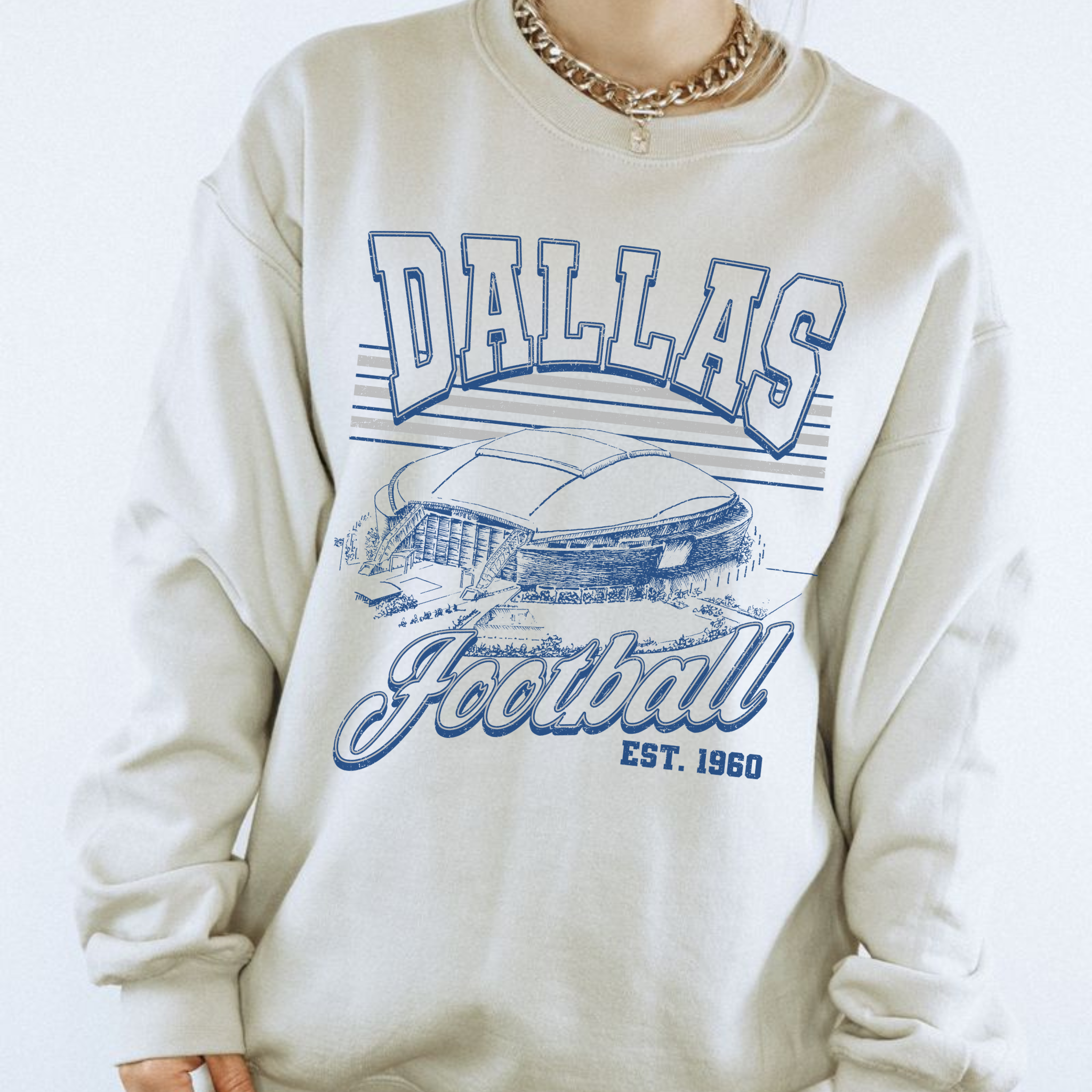 Show your team spirit in vintage style with our Dallas Football Crewneck Sweatshirt. Featuring a hand-drawn stadium illustration and bold retro lettering, this cozy unisex pullover celebrates Dallas football history since 1960. The relaxed fit, soft cotton-blend fleece, and neutral sand color make it perfect for game days, casual outings, or lounging at home. Layer it up for cooler weather or wear it solo for a laid-back look that still scores big on style.
