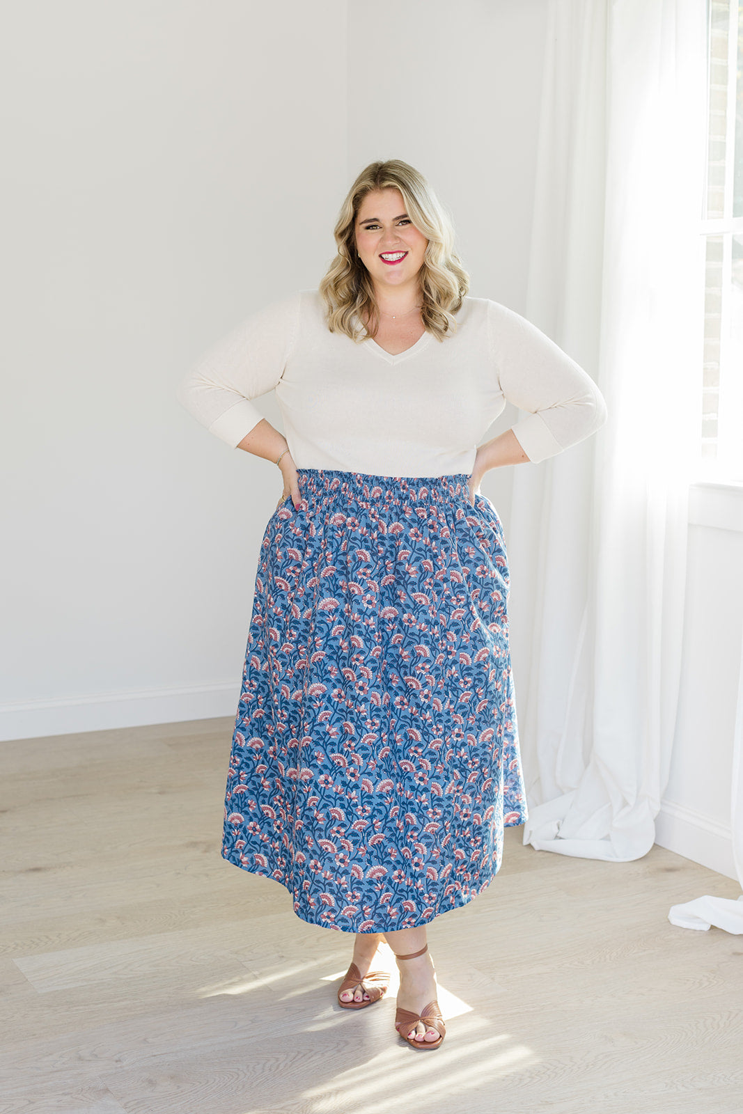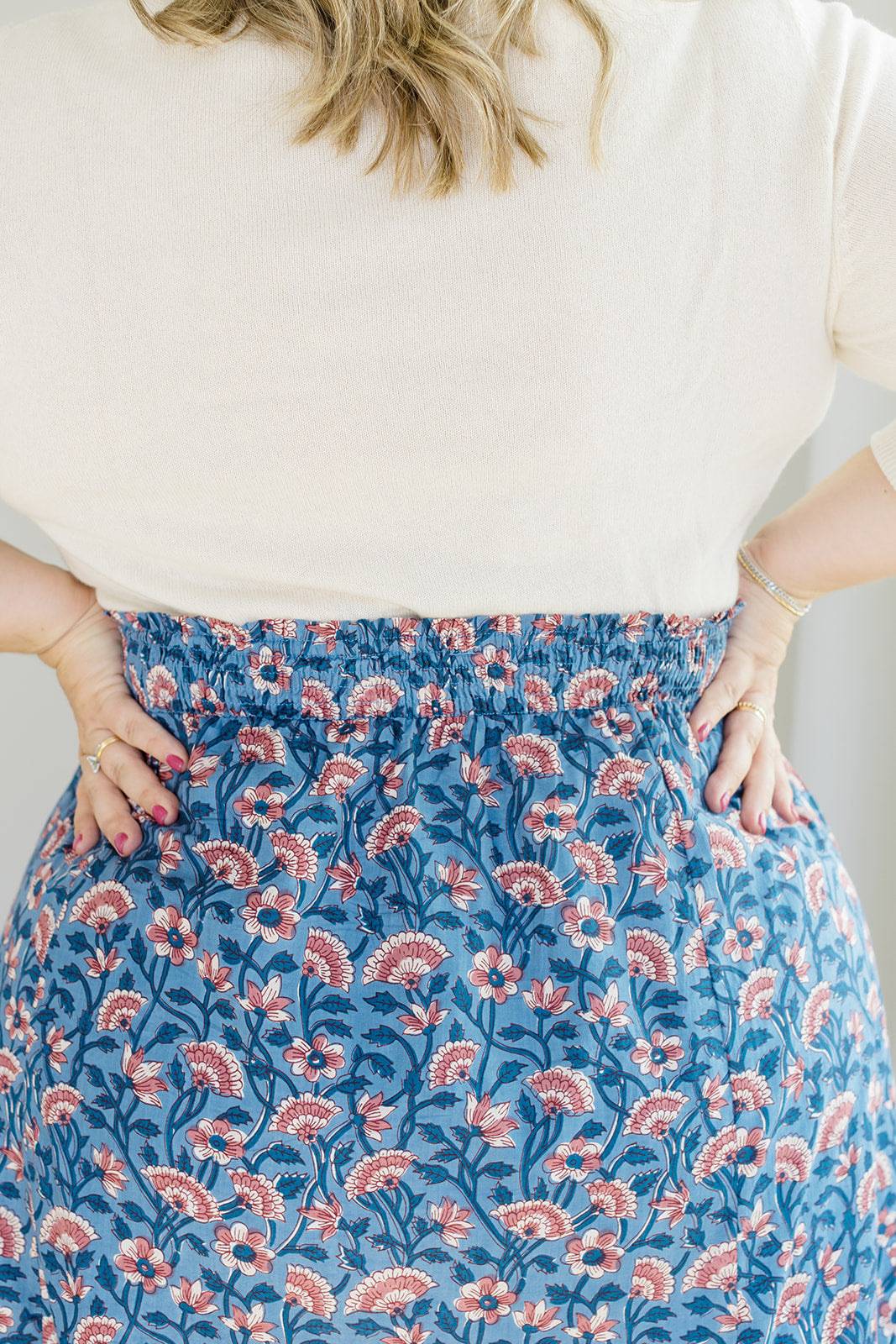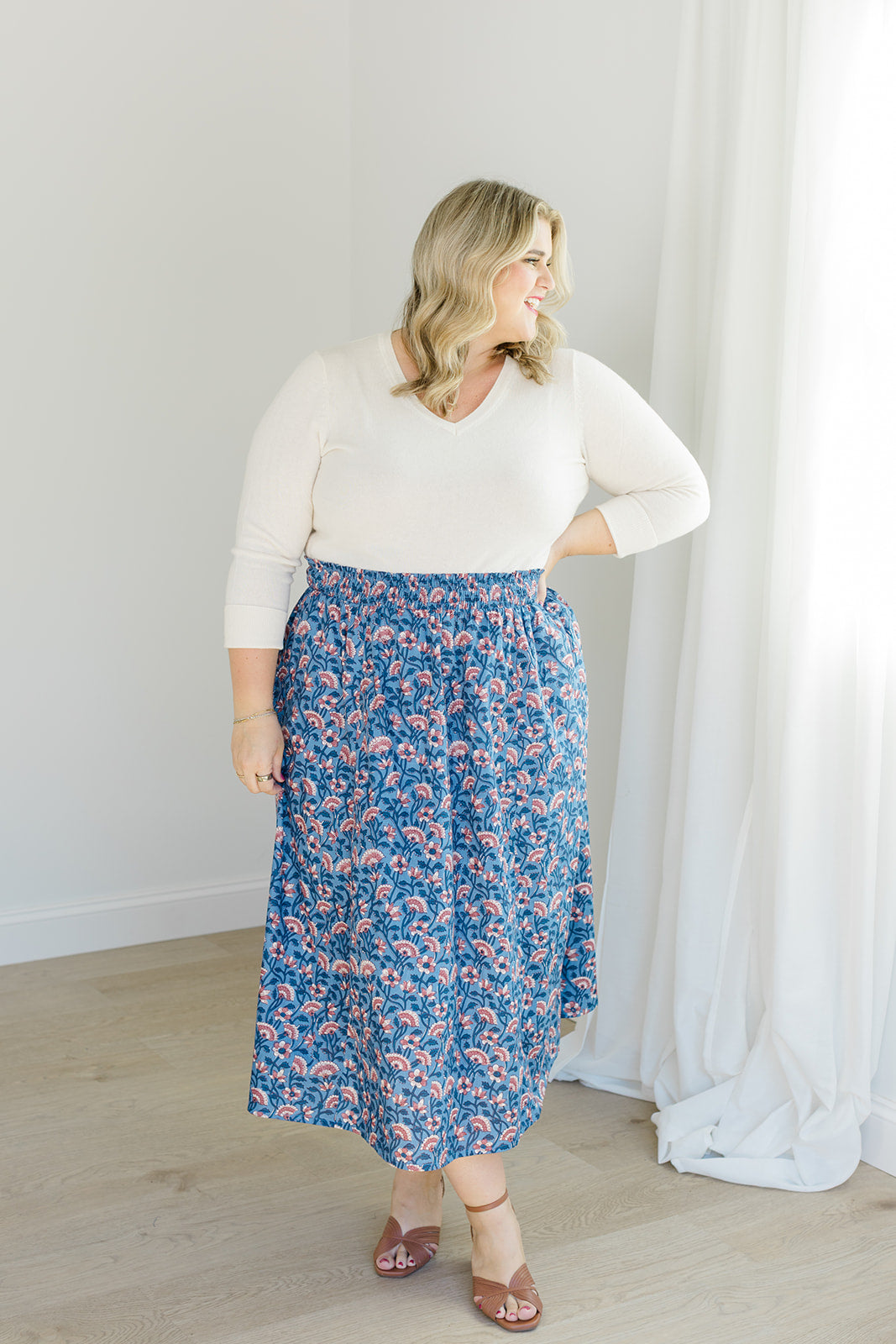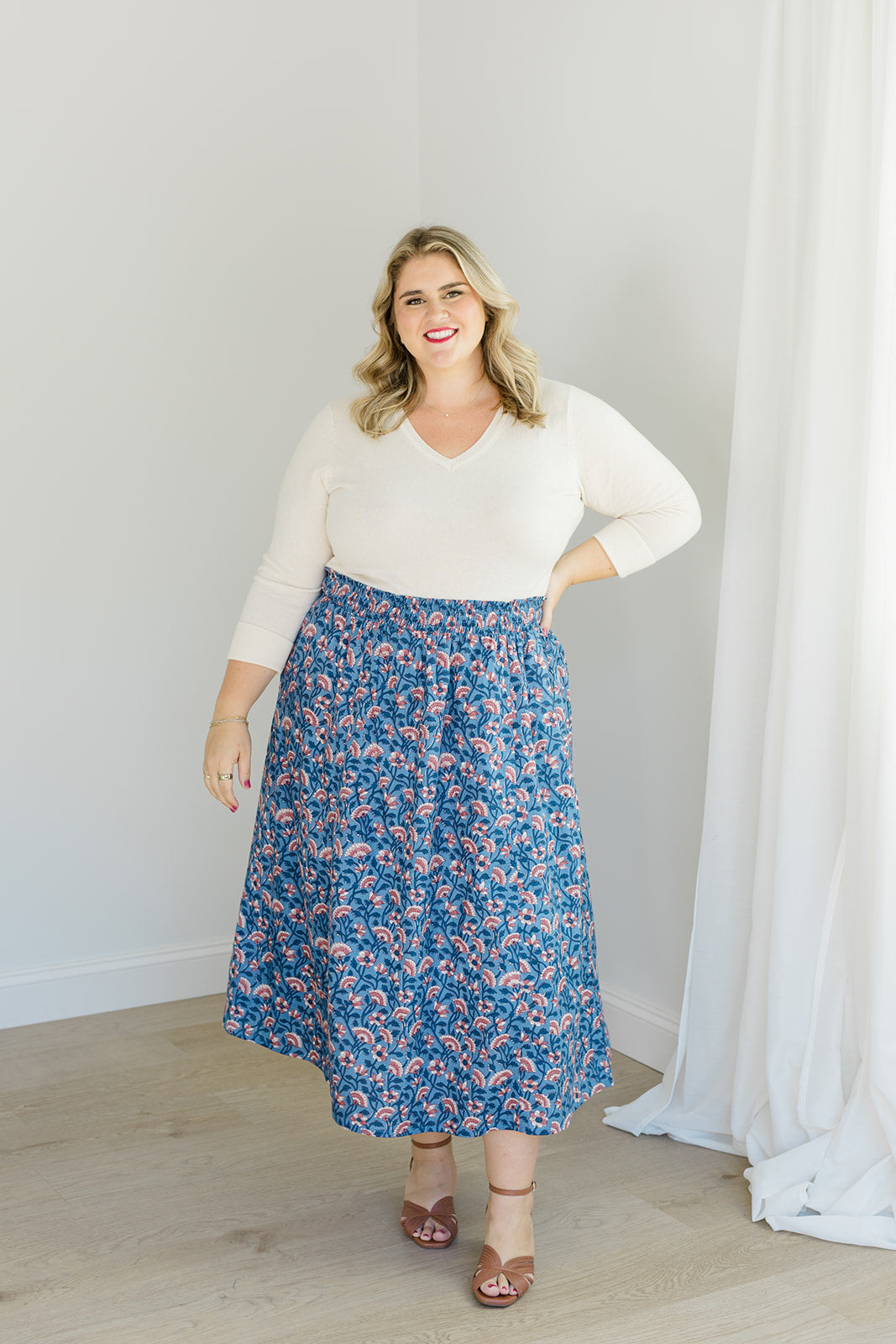 Romantic movement meets thoughtful details in The Melissa Skirt in Indigo Bloom. With a smocked waistband, practical side pockets, and a fully lined design, this skirt combines ease with function. The flowing silhouette works beautifully with the Jess Top for a matching set or with a cozy sweater for a seasonal mix-and-match.