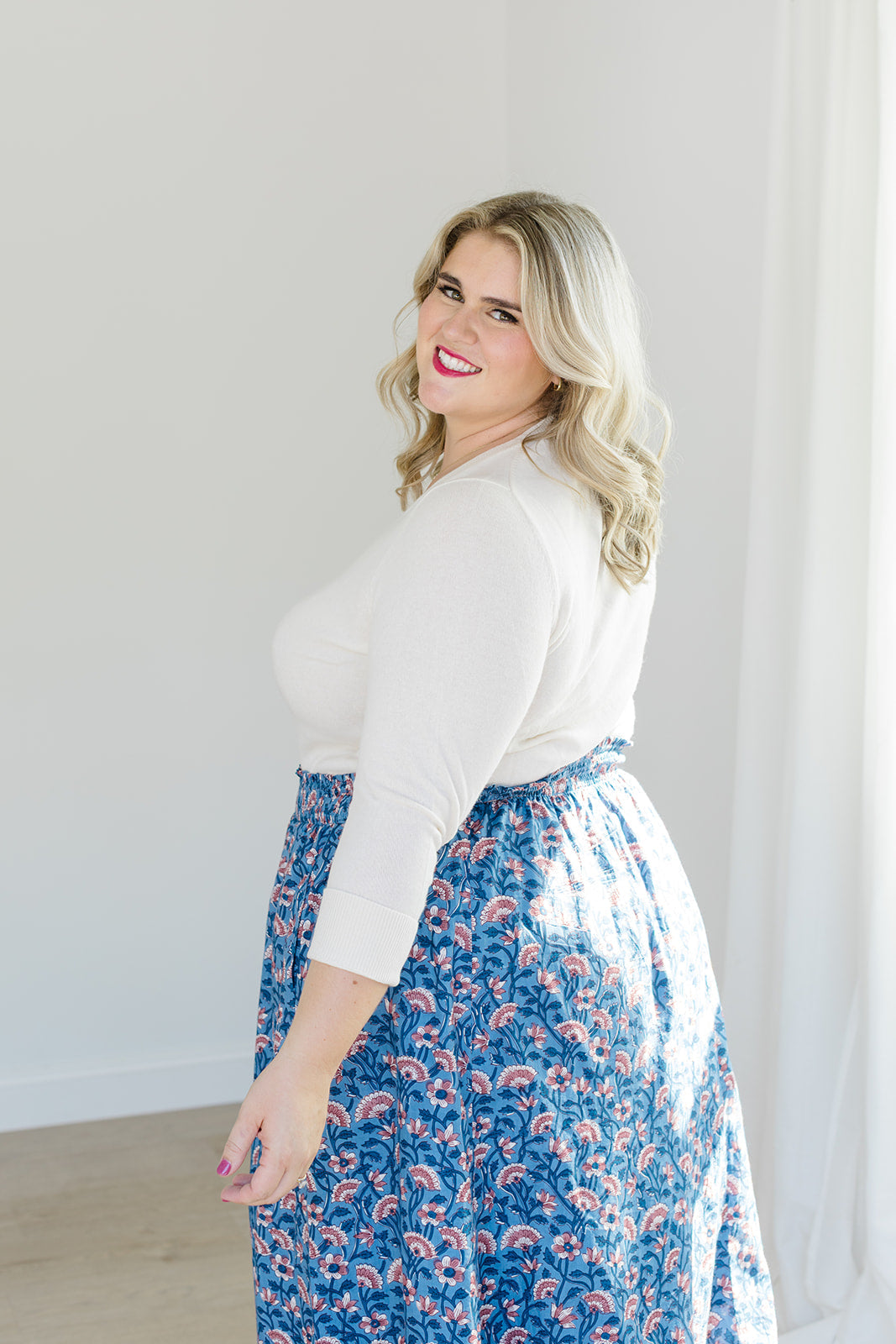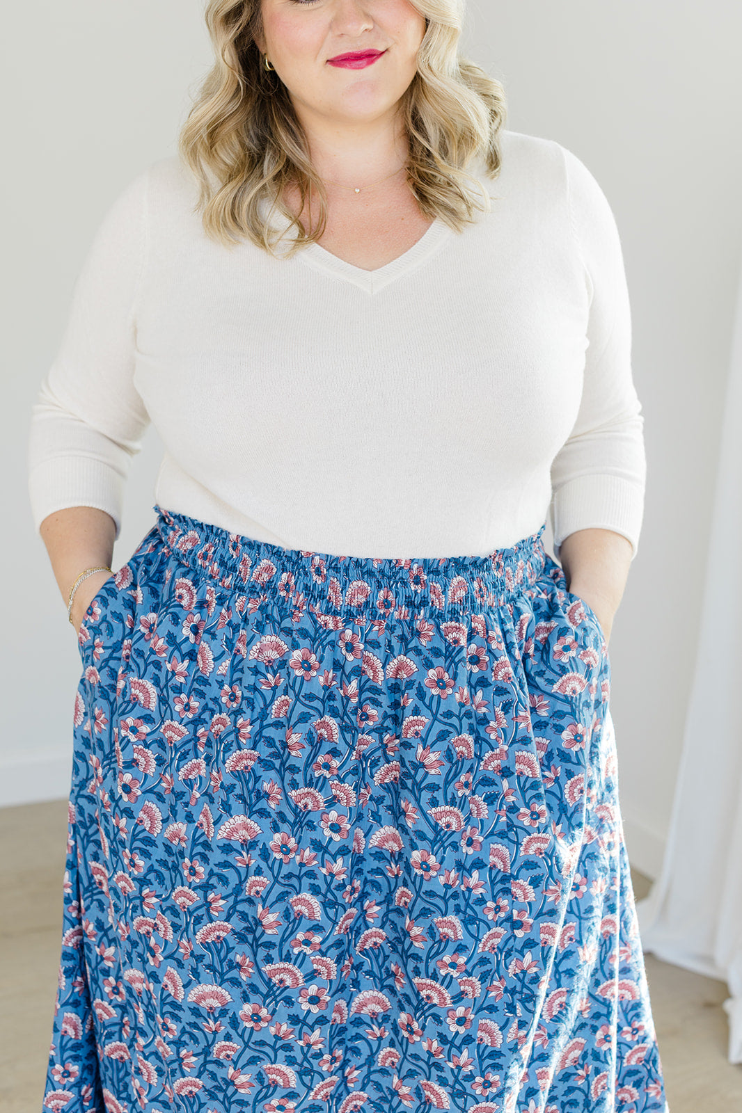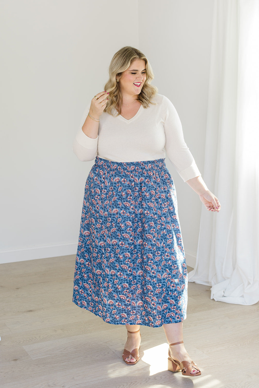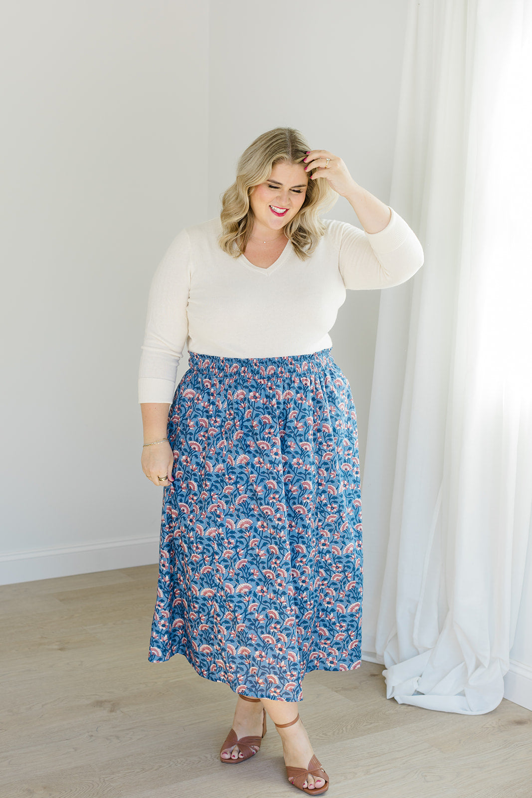 Romantic movement meets thoughtful details in The Melissa Skirt in Indigo Bloom. With a smocked waistband, practical side pockets, and a fully lined design, this skirt combines ease with function. The flowing silhouette works beautifully with the Jess Top for a matching set or with a cozy sweater for a seasonal mix-and-match.