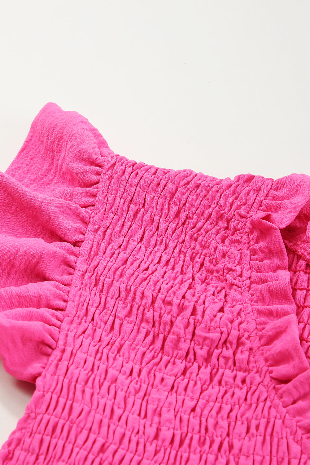 - This v-neck blouse is an ideal choice for showing off your (fierce sense of style). In a solid color, it can be dressed up or down for a classic look. The smocked detailing brings a unique twist to the fit, while the ruffle accents add a playful and three-dimensional touch.