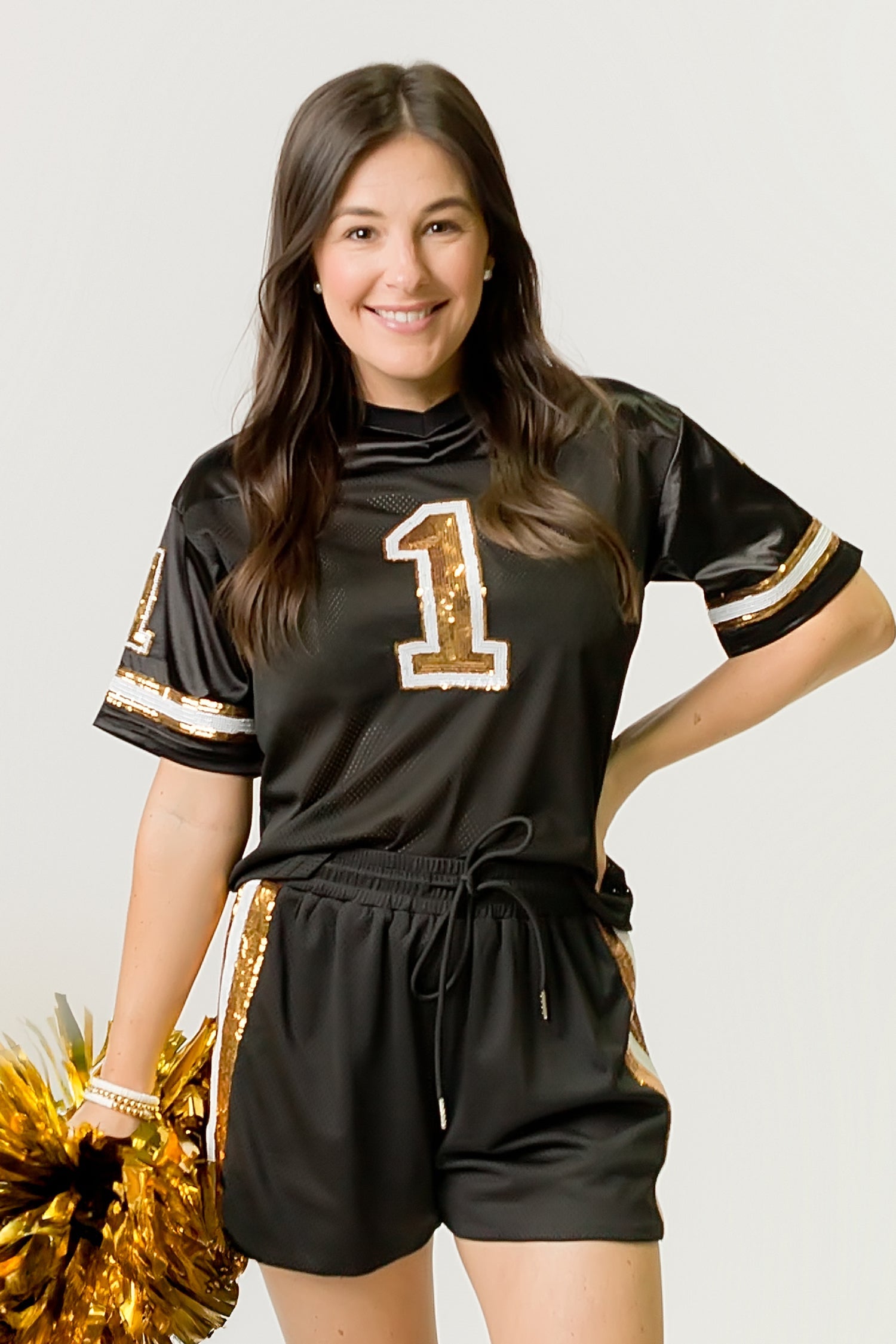 Runs small! We recommend sizing up. Shine bright and steal the spotlight with this Black and Gold Sequin Jersey. Its dazzling sequins catch every eye, while the comfortable jersey fabric keeps you feeling fabulous all day or night. Perfect for adding a playful sparkle to any outfit, this jersey turns ordinary moments into unforgettable celebrations.