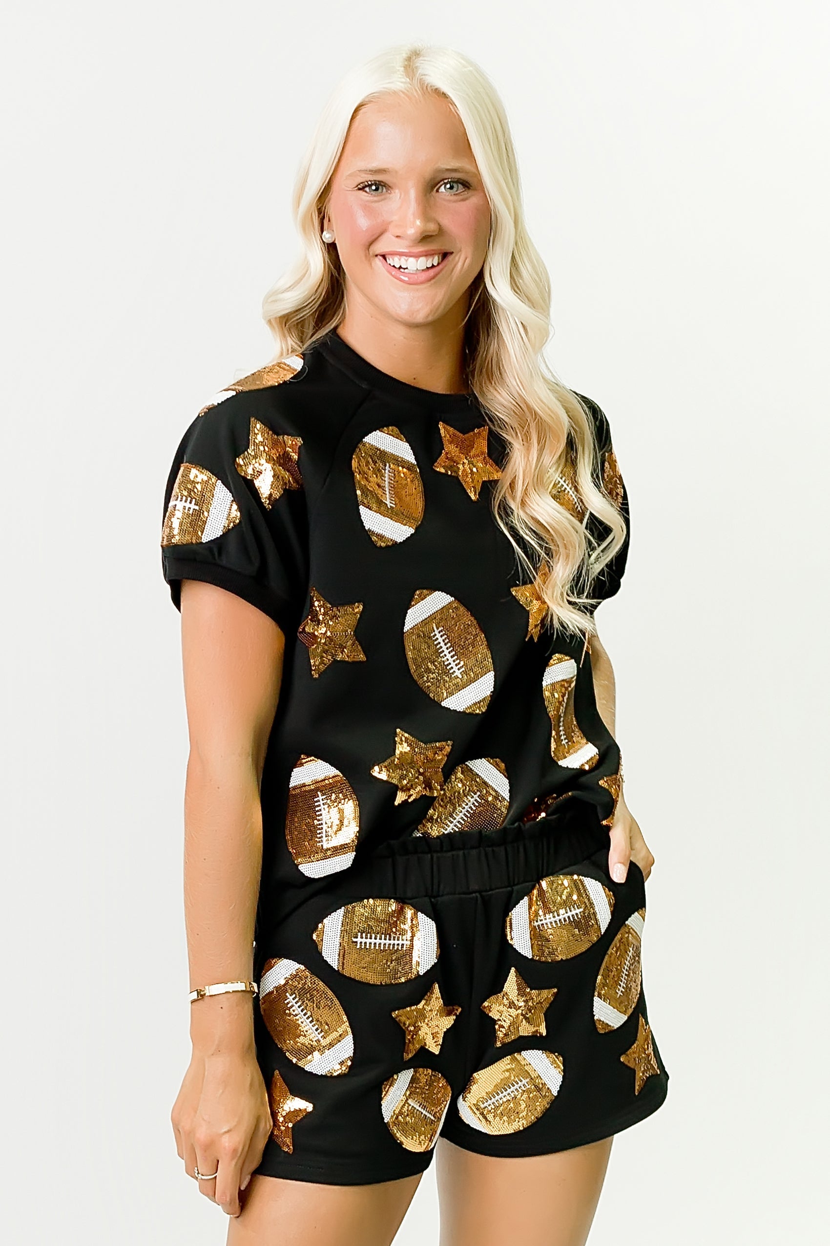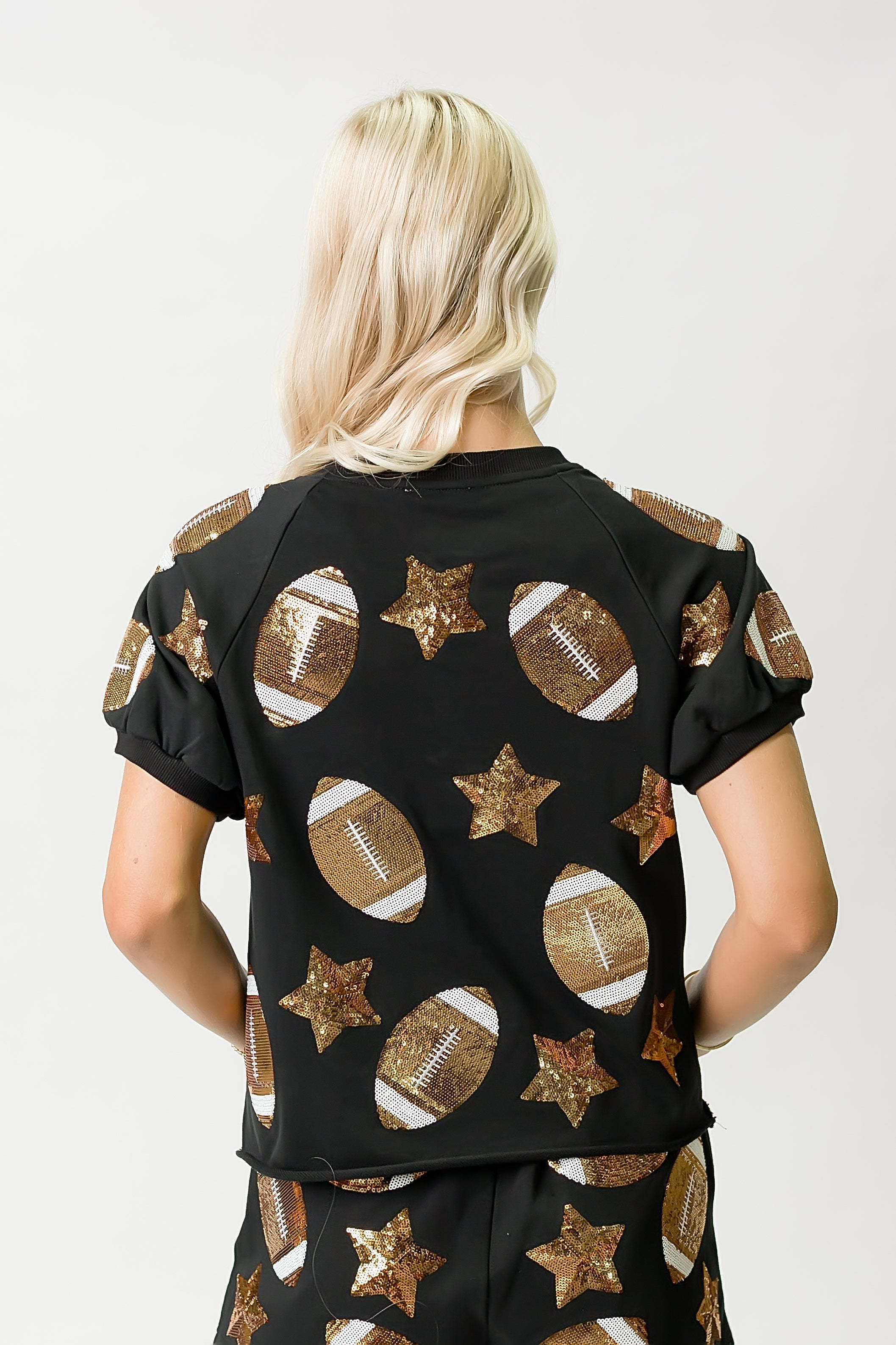 Shine bright on game day with this Black Football Sequin Top! Covered in sparkling sequins that catch every light, it’s perfect for showing off your team spirit with a fun, festive twist. Pair it with your favorite jeans or skirt for a playful look that scores style points wherever you go.