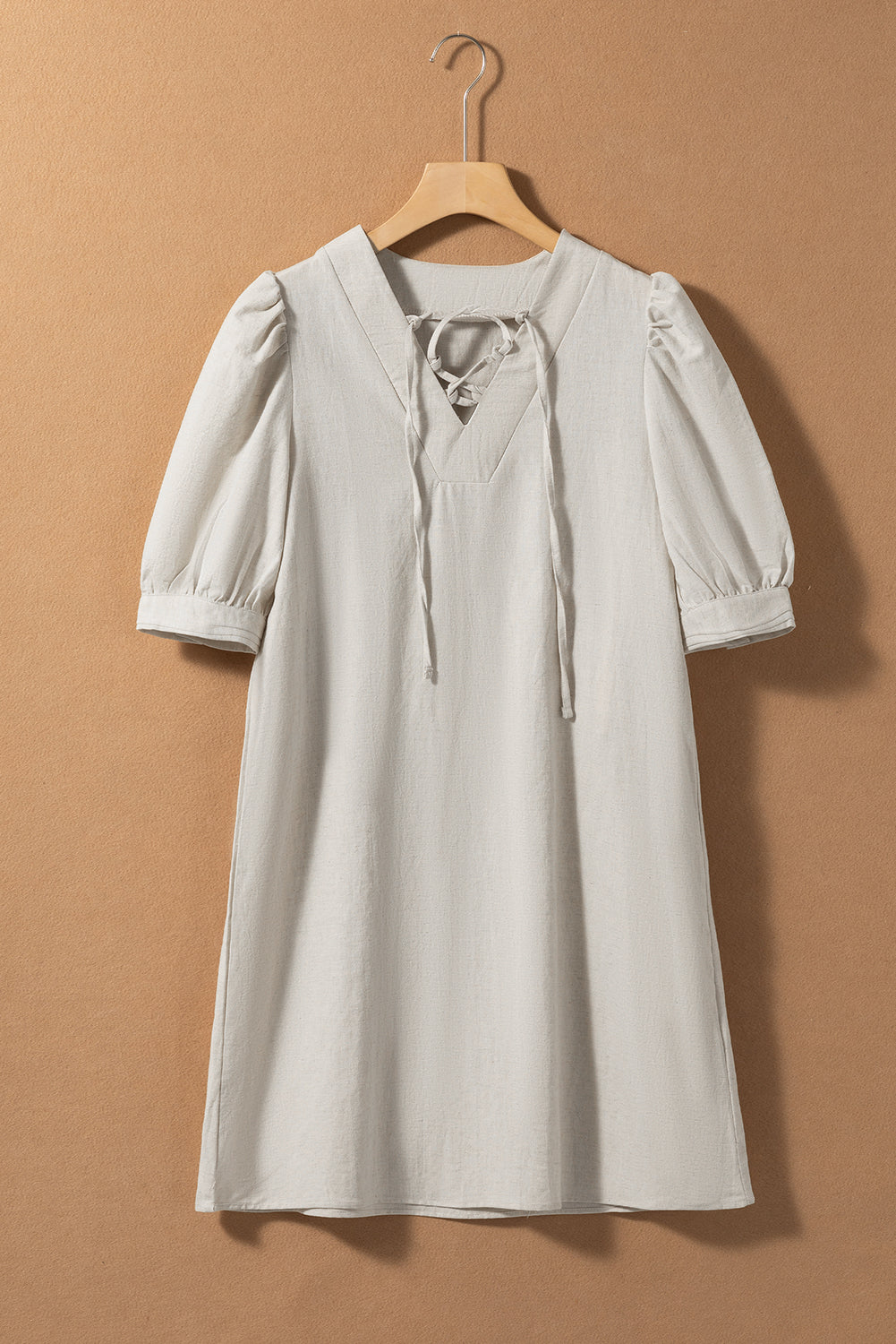 This dress is a simple yet timeless choice for any event. The V-neckline accentuates your figure and adds a touch of femininity. With unique bubble sleeves, you'll definitely be the center of attention. Show off your legs and embrace a playful and youthful look