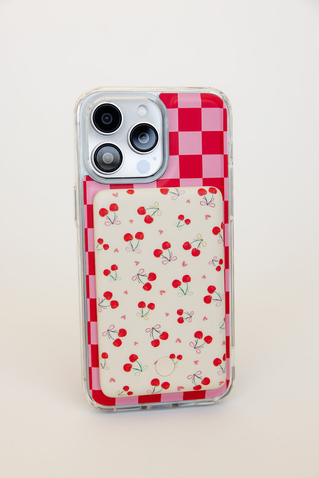 Design: Watercolor red cherries with petite bright bows and pink hearts on a cream background.
