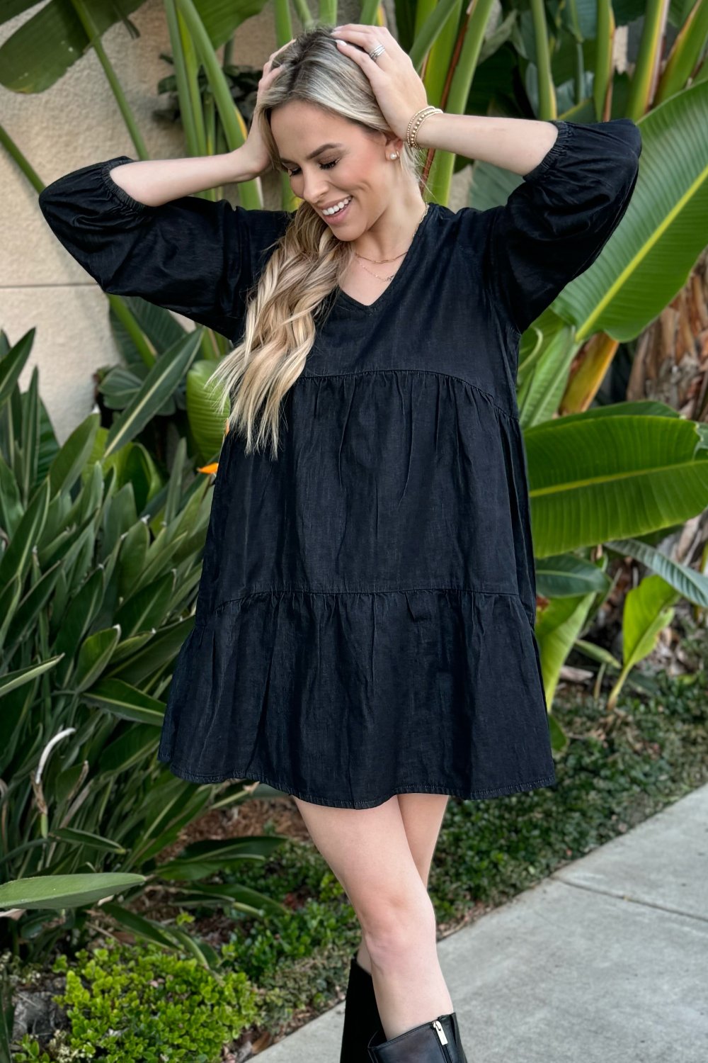 This darling chambray dress flaunts a breezy tiered silhouette, complete with a charming v neck and puff sleeves. Crafted from chambray fabric, it's a timeless piece that will never go out of style. And with its bracelet sleeves, it's perfect for the changing seasons. Plus, the tiered ruffles add a playful and girly touch!