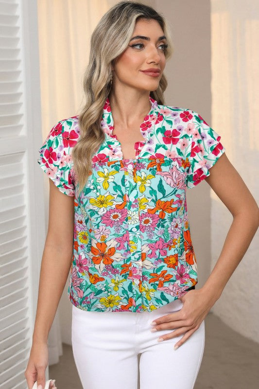 Bloom into summer style with this enchanting blouse that's as breezy as a garden breeze. The split neckline paired with a button front gives you effortless adjustability, while delicate flutter sleeves add a whimsical touch of movement. Crafted from lightweight, breathable fabric, it's your go-to piece for warm days when you want to look polished without feeling weighed down. Perfect for casual outings or dressing up with your favorite accessories. 100% Viscose