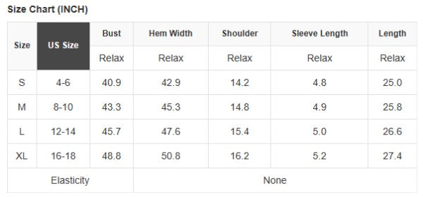 See size chart for approximate measurements