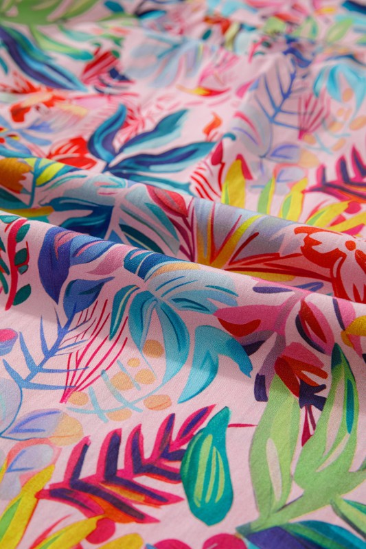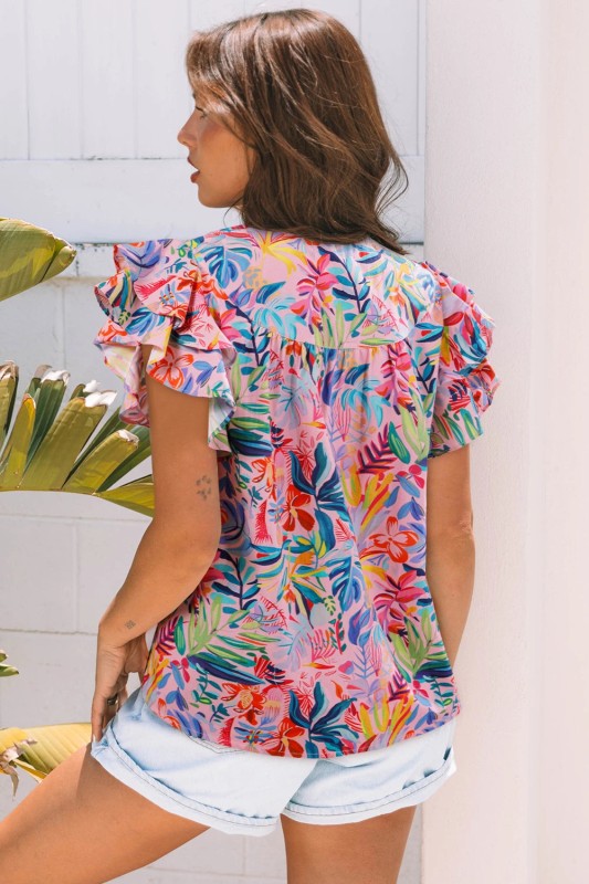 Escape to paradise with this tropical floral print blouse that captures vacation vibes year-round. The frilly notched neckline adds a playful touch of feminine flair, while ruffled short sleeves flutter with every movement, delivering soft comfort and effortless style. Crafted from lightweight, breathable fabric, it's your go-to piece for warm weather adventures, whether you're heading to the beach or simply embracing your inner tropical dreamer. Cotton/Viscose