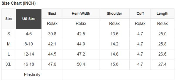 See size chart for approximate measurements