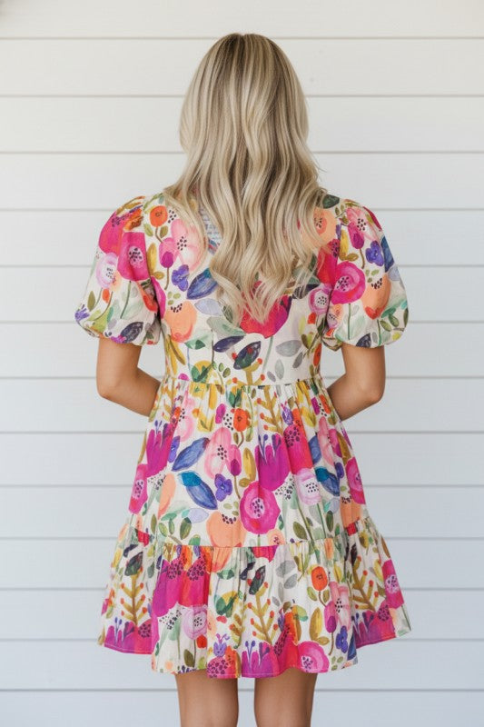 Turn heads in this charming floral dress that blends romance with playful style. Featuring soft floral patterns mixed with striped patchwork and delicate ricrac trim, this piece is anything but ordinary. The flattering V-neckline and bubble short sleeves create a sweet silhouette, while the tiered skirt adds movement and dimension. Crafted from 100% breathable cotton, it's as comfortable as it is cute, perfect for making a statement at any occasion. 100% Cotton