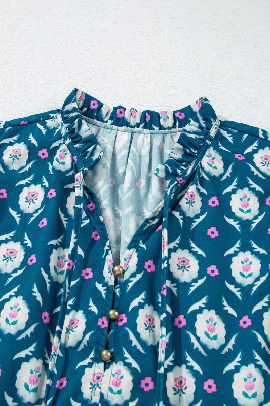 Floral Split Neck Ruffle Short Sleeve Dress