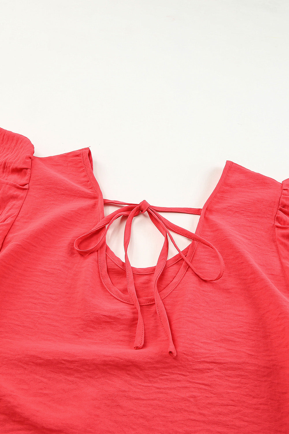 - This charming top is the perfect addition to your summer closet! Sporting a V-neck, short sleeves, and a relaxed fit, it's made from soft fabric for ultimate comfort. The back-tie and ruffle details add a touch of elegance and style. Pair it with pants, leggings, or shorts for any occasion, from dates to shopping to work and more!