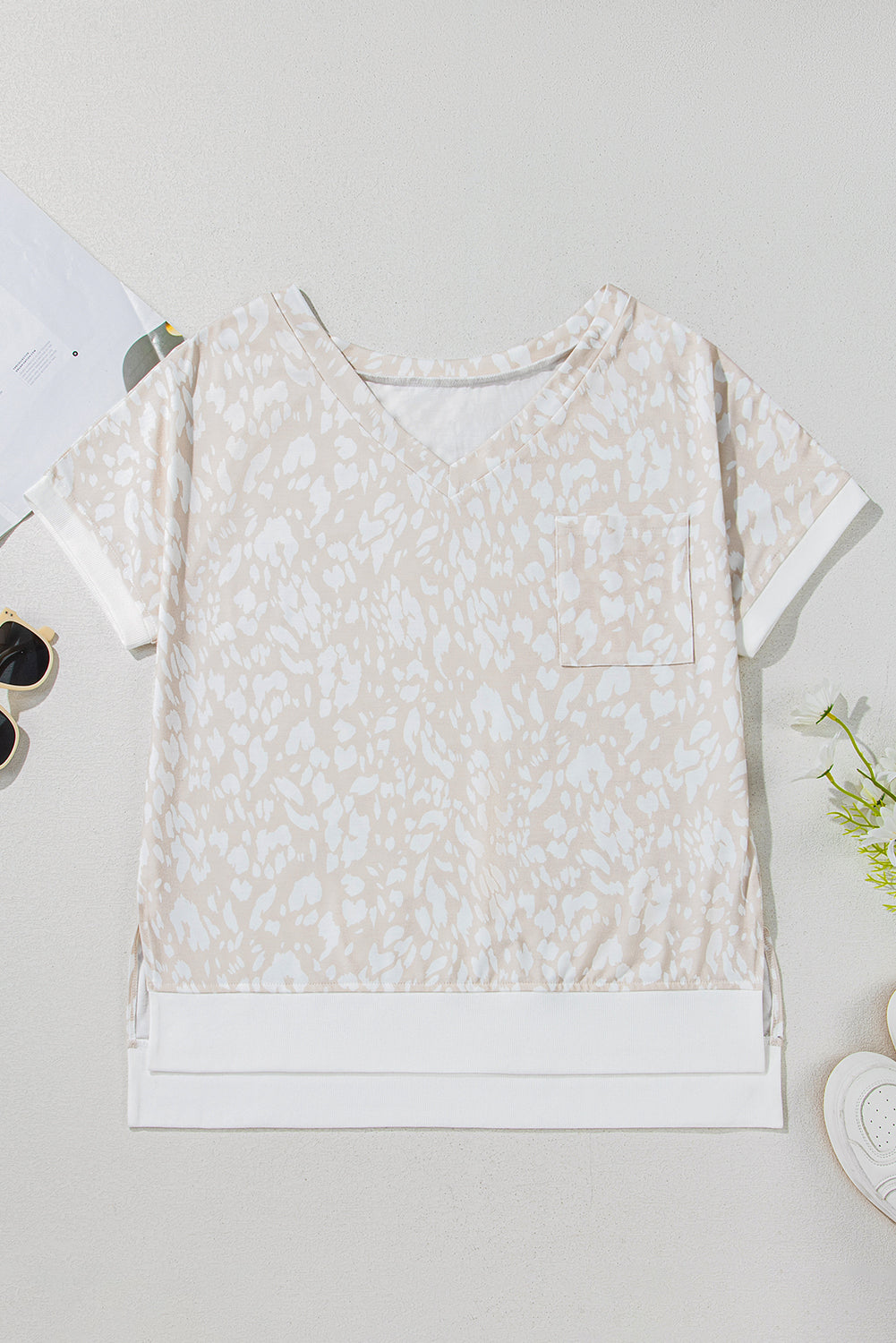 This trendy top boasts a fearless leopard pattern and flaunts a V-neck and side slits. The relaxed fit exudes effortless style for laid-back occasions. The breathable material guarantees comfort and flexibility all day long. Add a wild touch to your look with this effortlessly cool piece.