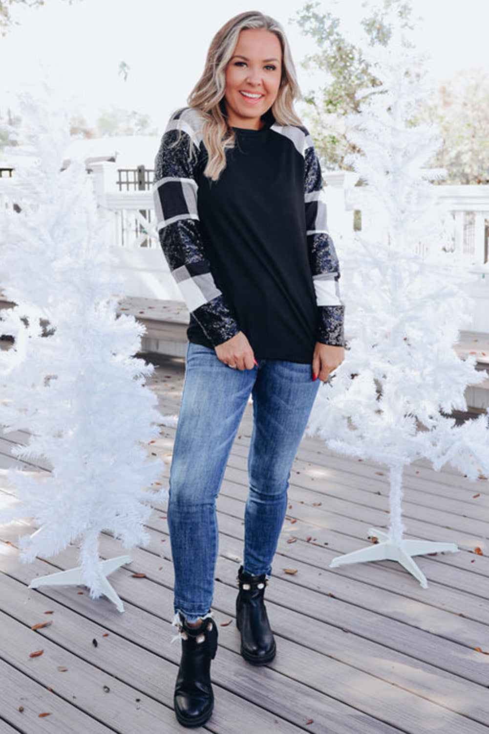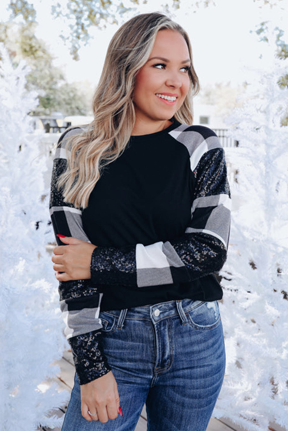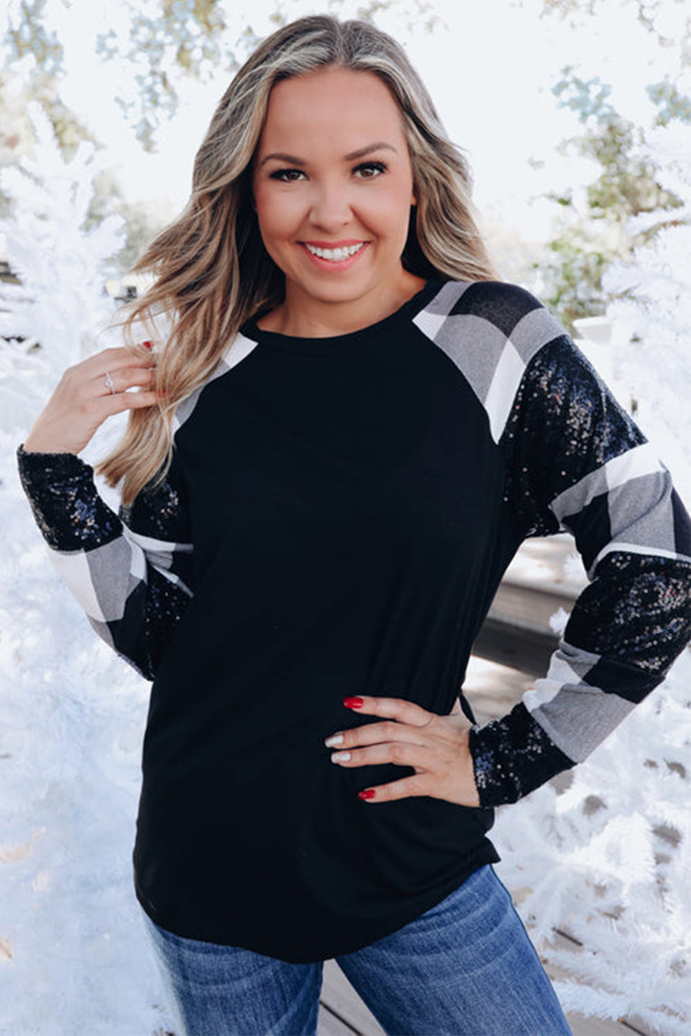 Kayla Sequin Plaid Patchwork Raglan Sleeve Top