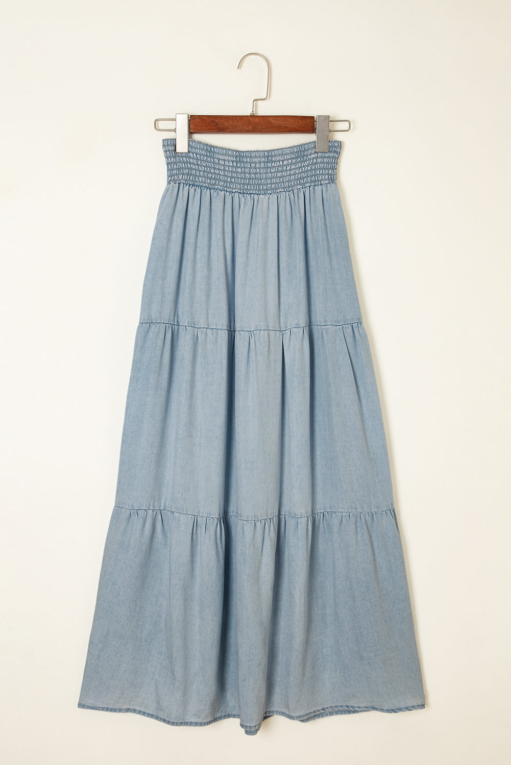 Strut your stuff in our smocked high waist denim marvel! This Lisa Tiered Maxi Skirt hugs your waist with stretchy comfort while cascading dramatically to the floor. The playful tiers add bounce to your step, transforming ordinary denim into a flirty fashion statement. Perfect for days when you want to feel fabulous without sacrificing comfort!