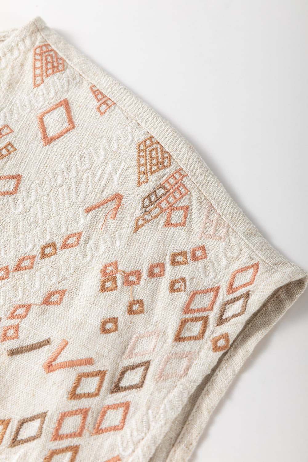 Get ready to elevate your outfit with this chic blouse! Featuring beautifully detailed geometric embroidery, this top adds an artistic touch to any look. Stay cool and stylish in the warm weather with its short sleeves. And don't forget to add a playful touch with the tassel tie detail, giving off a fun and bohemian vibe.