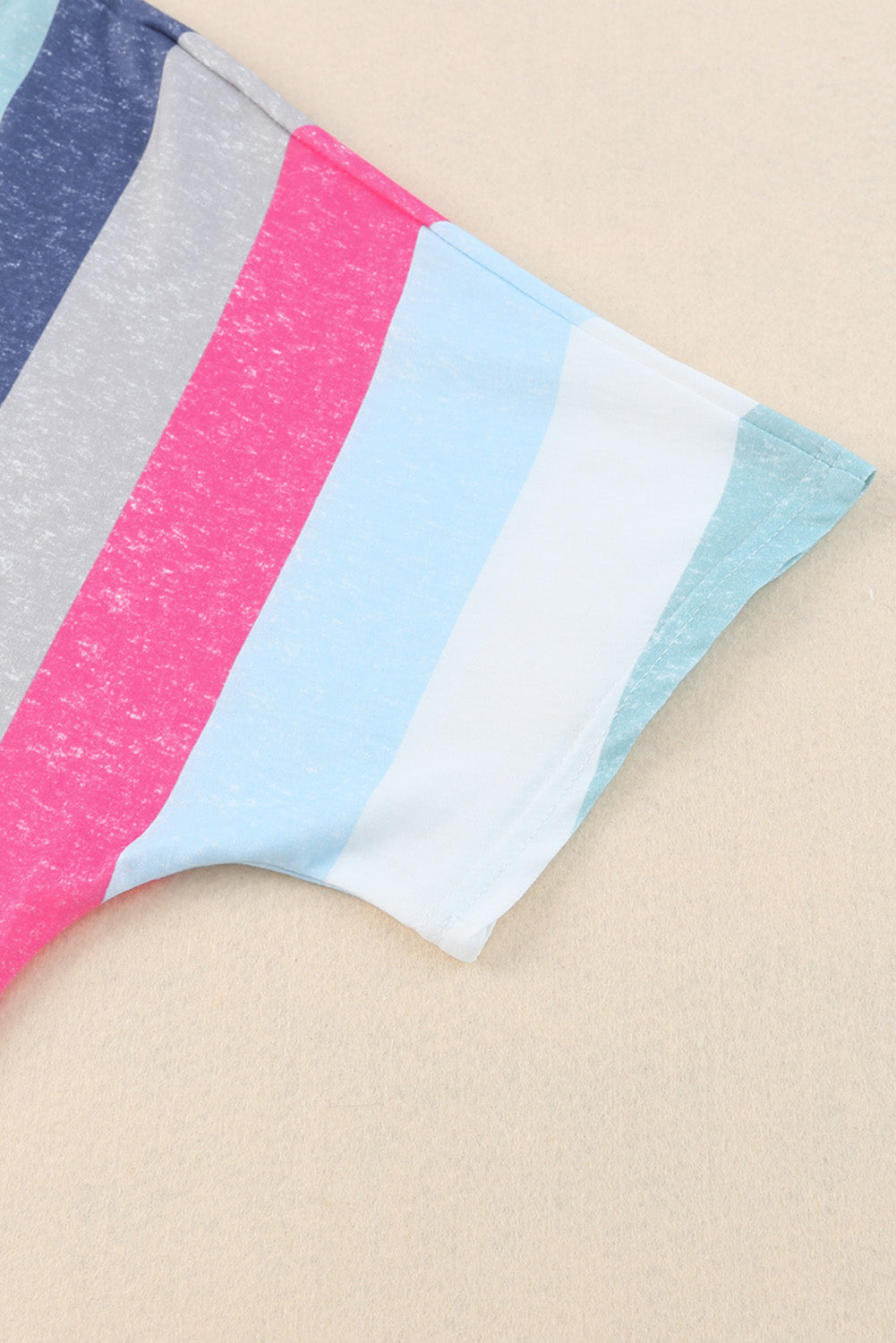 The Marie Patchwork Tee is a playful and quirky choice for adding some humor to your wardrobe. Its horizontal stripes of different colors and widths are stitched together in a unique design that is sure to catch attention. Made with a soft and comfy blend, this shirt is perfect for any occasion - from casual to dressy. Its v-neckline adds a touch of femininity to the classic style, while its loose and relaxed fit ensures comfort for women of all shapes and sizes.