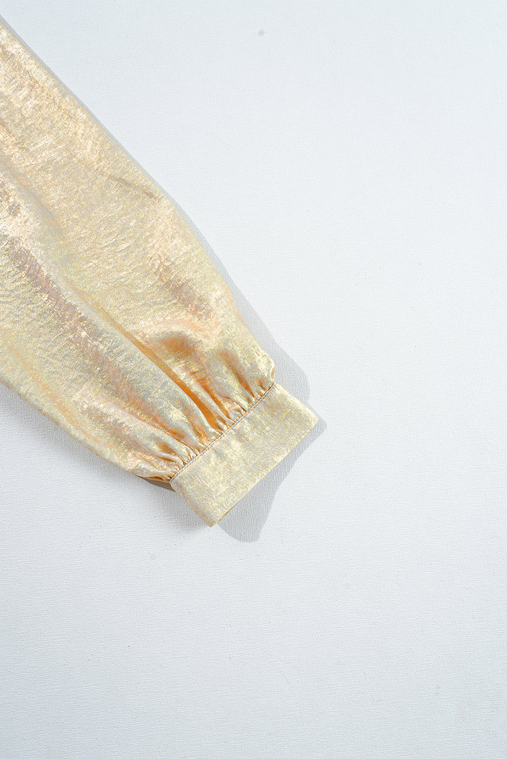 Shine bright in this metallic fabric babydoll blouse! Featuring a flirty frilled V-neckline, statement puff sleeves, and a flowy silhouette for a feminine yet bold look. Perfect for standing out in style.
