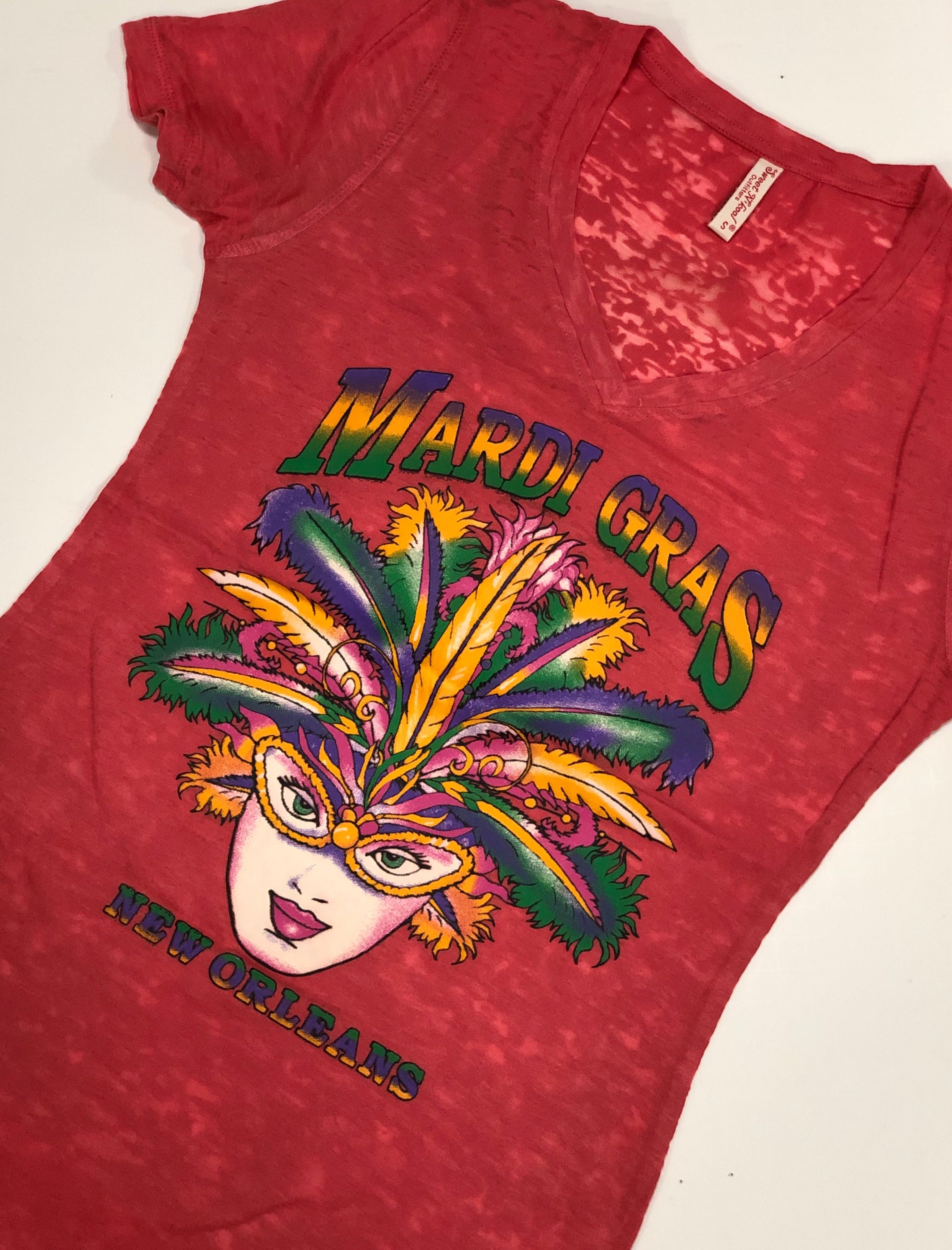 Laissez les bon temps rouler! This t-shirt features a woman's face wearing a Mardi Gras mask and reads "New Orleans Birthplace of Jazz"