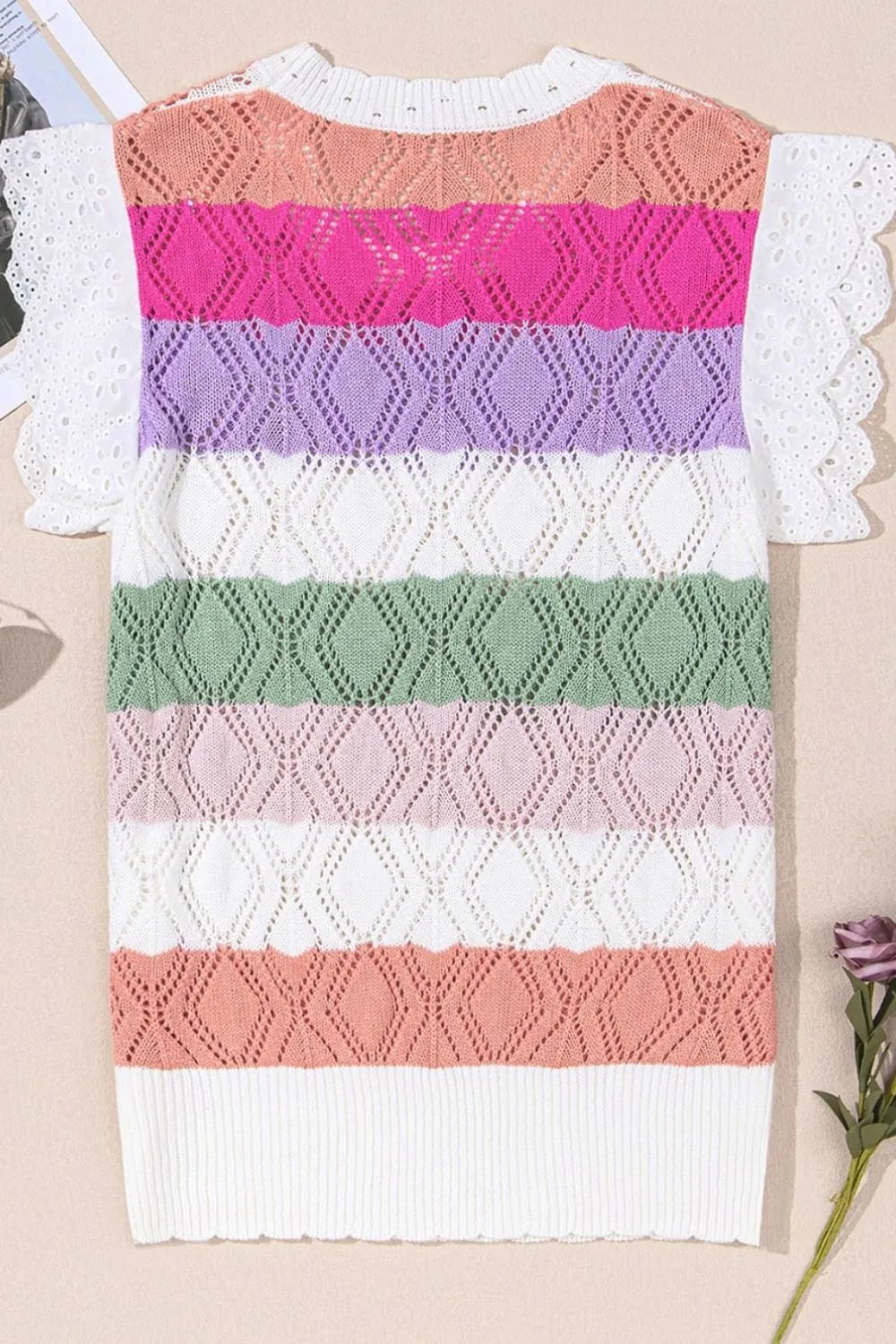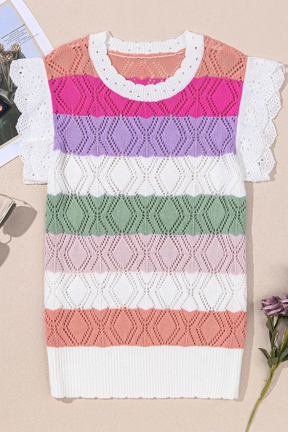Openwork Round Neck Cap Sleeve Knit Top