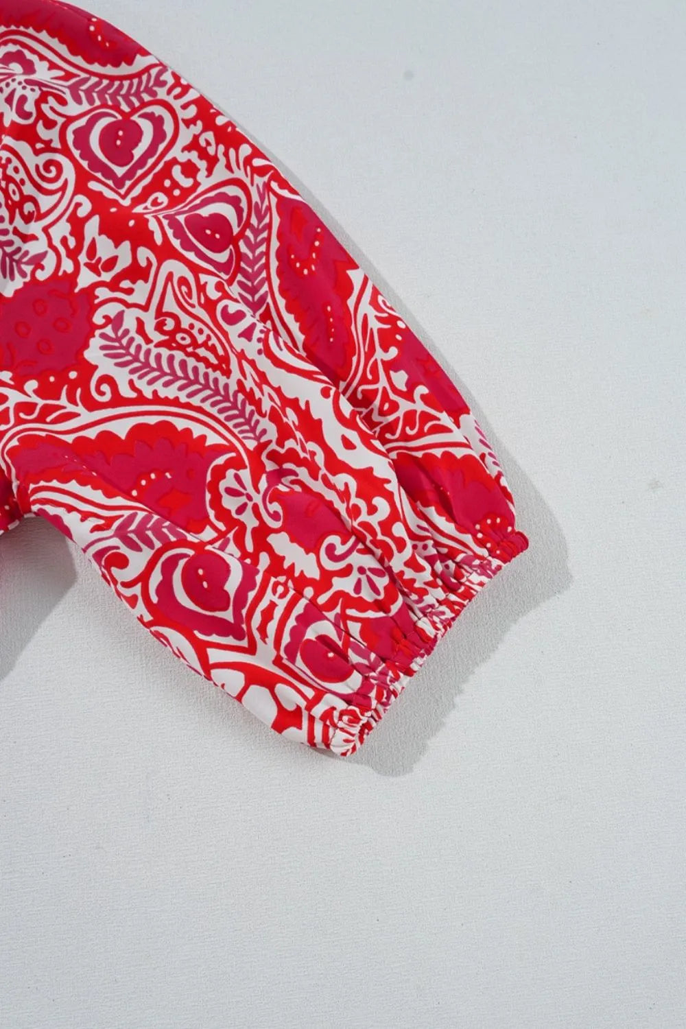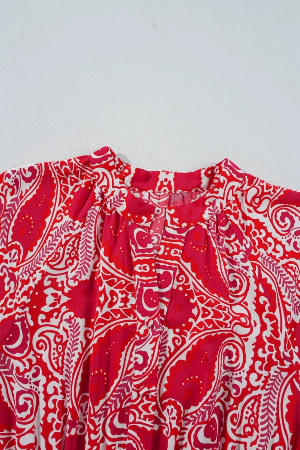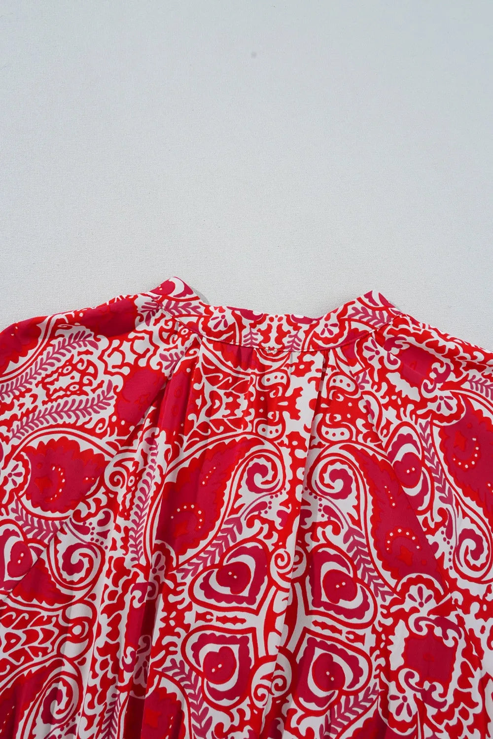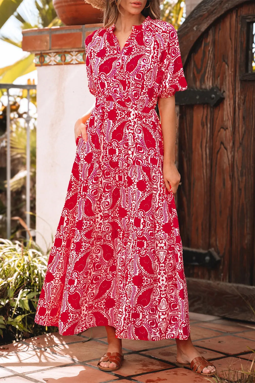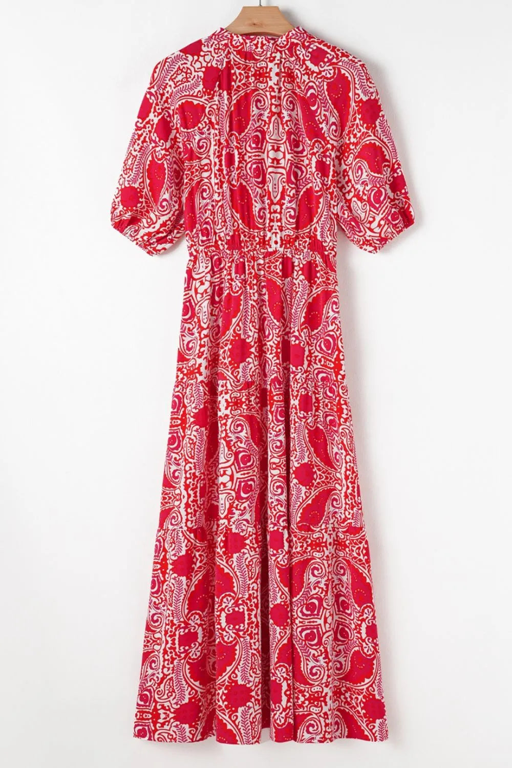 Paisley Print Side Slit Puff Sleeve High Waist Maxi Dress