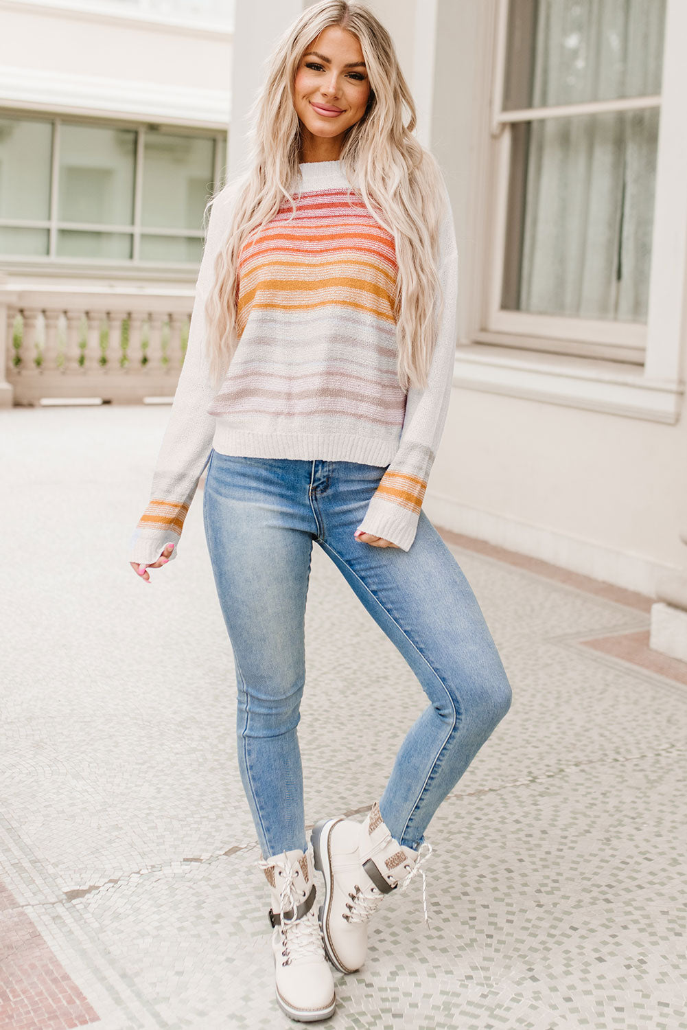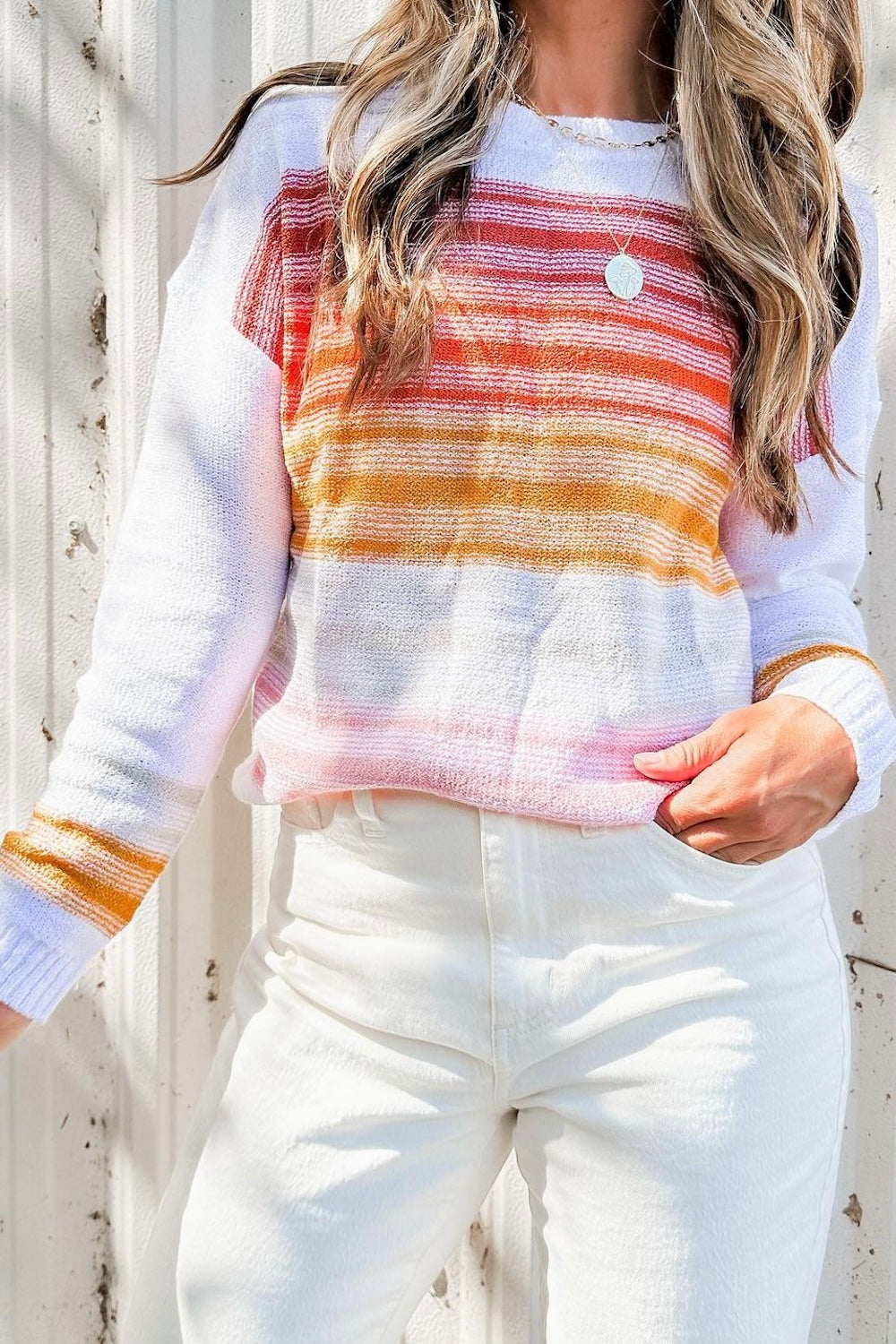 Be a standout in this Poppy Stripe Long Sleeve Round Neck Sweater with its one-of-a-kind multicolor pattern! Keep warm in cooler weather with its long sleeves and embrace its classic and versatile round neckline. Wear it solo or layer it under a jacket when the chill sets in!