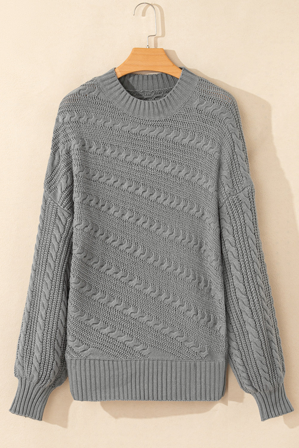 This sweater is all about style and elegance, featuring cable knitting and ribbed trim for a sophisticated touch. Its lantern sleeves and mock neck bring a sweet charm to any outfit. Pair with a skirt, leggings, or jeans for a complete look.