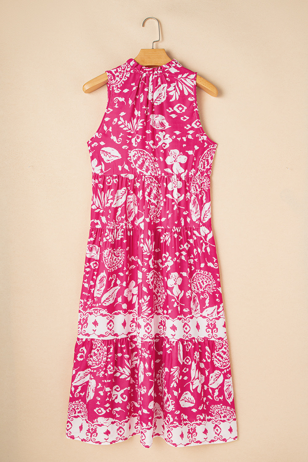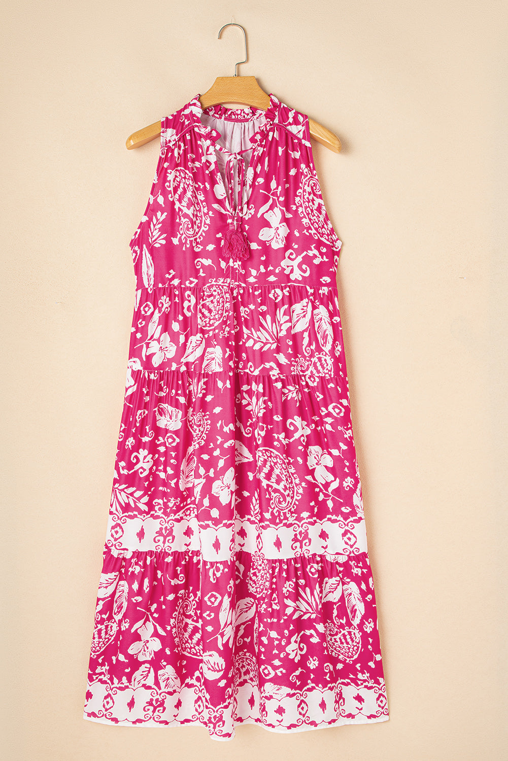 Get ready to embrace the spring season in style with this flirty floral dress. Perfect for warm days, the sleeveless cut keeps you cool while the trendy tasseled lace-up neckline adds a touch of flair. And with a twirl-worthy tiered ruffle design, you'll be feeling playful and chic all day long!
