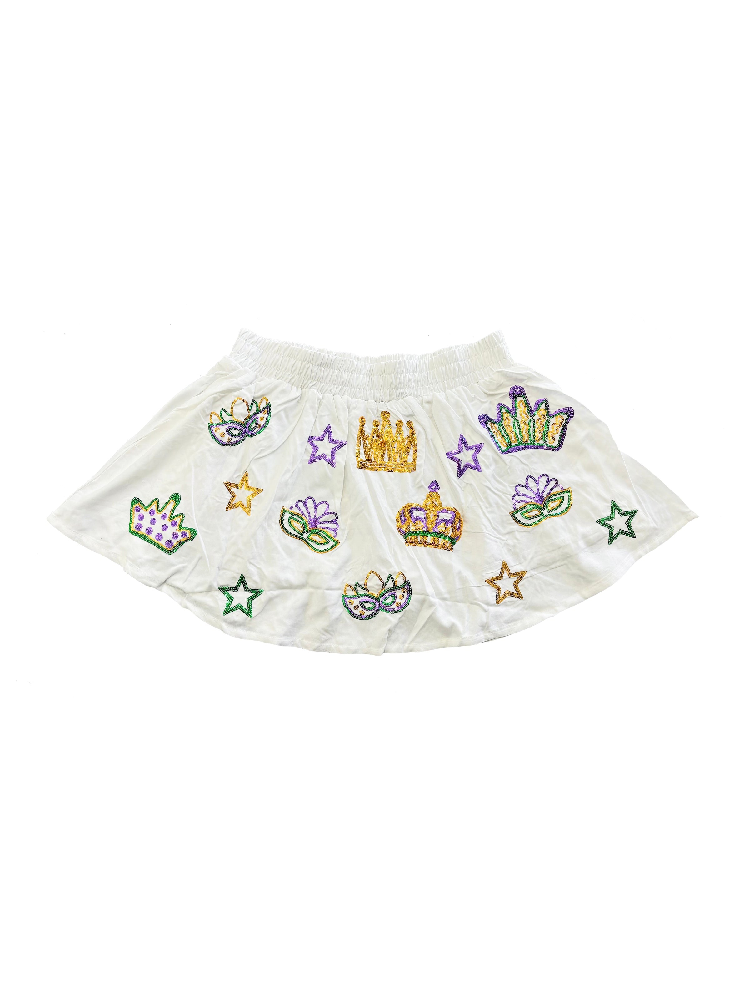 Rule the fashion kingdom with our Adult Crown Skort in White! This unique skort features a dazzling crown and mask sequin design, with shorts underneath and convenient pockets on the sides. Perfect for adding a touch of whimsy to your wardrobe, and keeping your essentials close at hand.