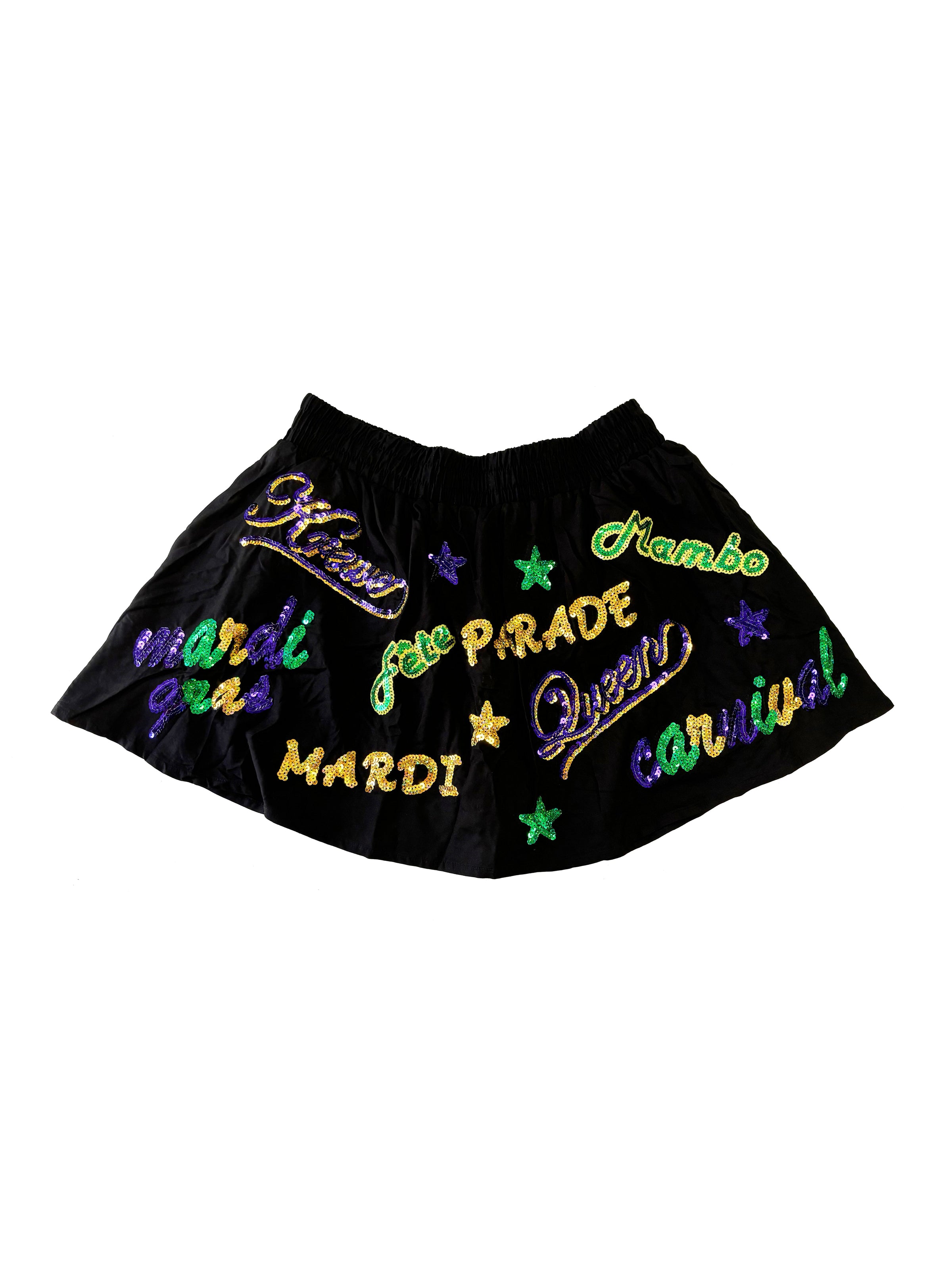 Unleash your wild side in our Adult Mardi Gras Explosion Skort! Made from comfortable viscose fabric with hidden shorts underneath, this black skort will keep you comfortable while you dance the night away. With fun sequin appliqués spelling out Mardi Gras words like Krewe, Mambo, Parade, and more, you'll be the life of the party.