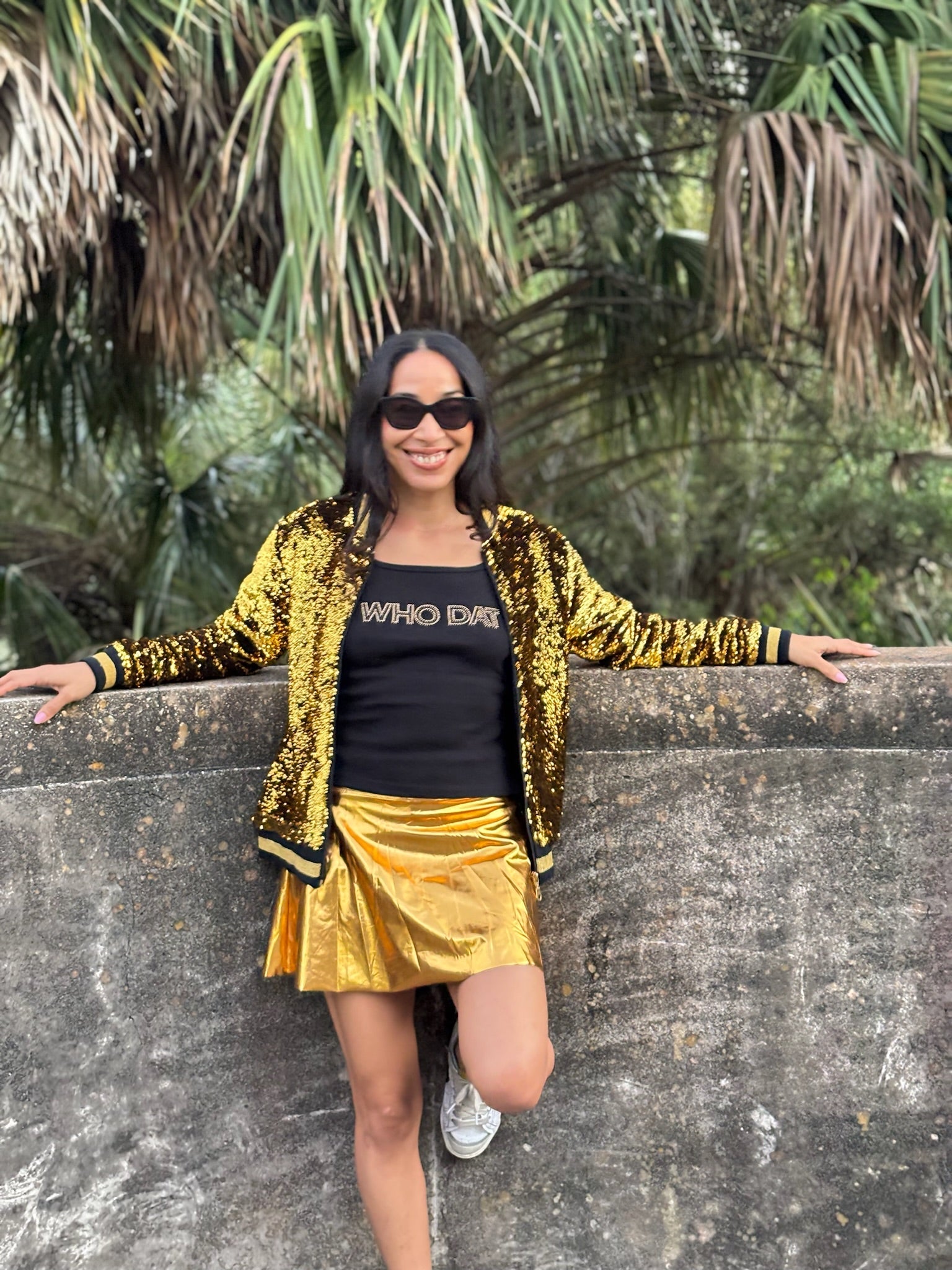 Get ready to shine (literally) with our Adult Metallic Skort in Gold! Perfect for game day or a Mardi Gras parade, this skort features a metallic fabric that will catch everyone's eye. Plus, the shorts underneath have pockets for ultimate convenience. Show off your playful side (and your game day spirit) with this quirky and fun skort!