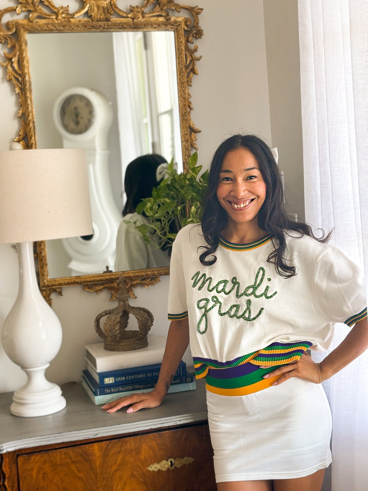 Get ready to parade in style with our Adult Straight Cut Skort in White! This skort features a unique purple, green, and gold stripe waistband, perfect for standing out during Mardi Gras celebrations. So go ahead, let your playful side shine through and show off your fun-loving spirit in this quirky and stylish skort.