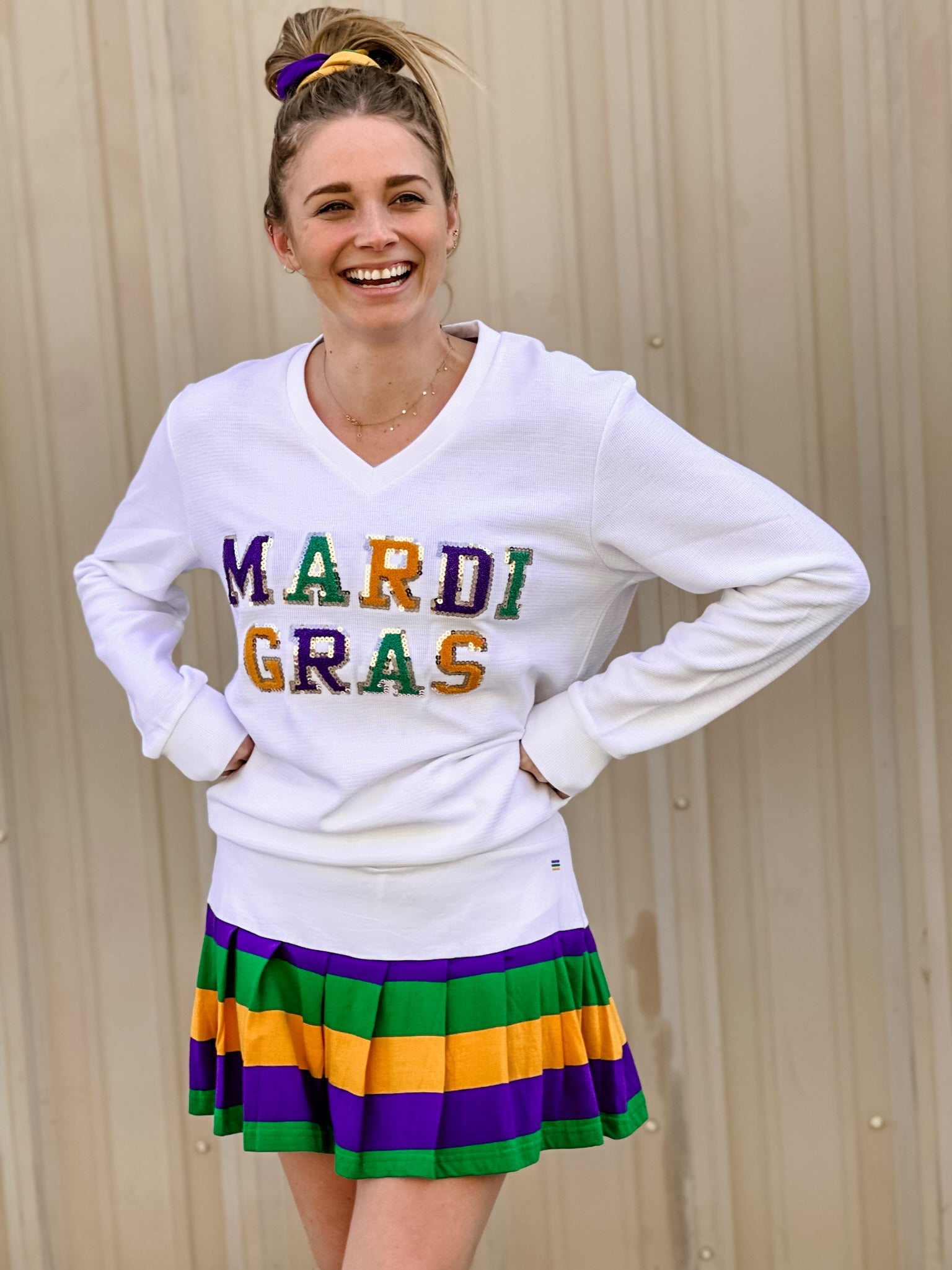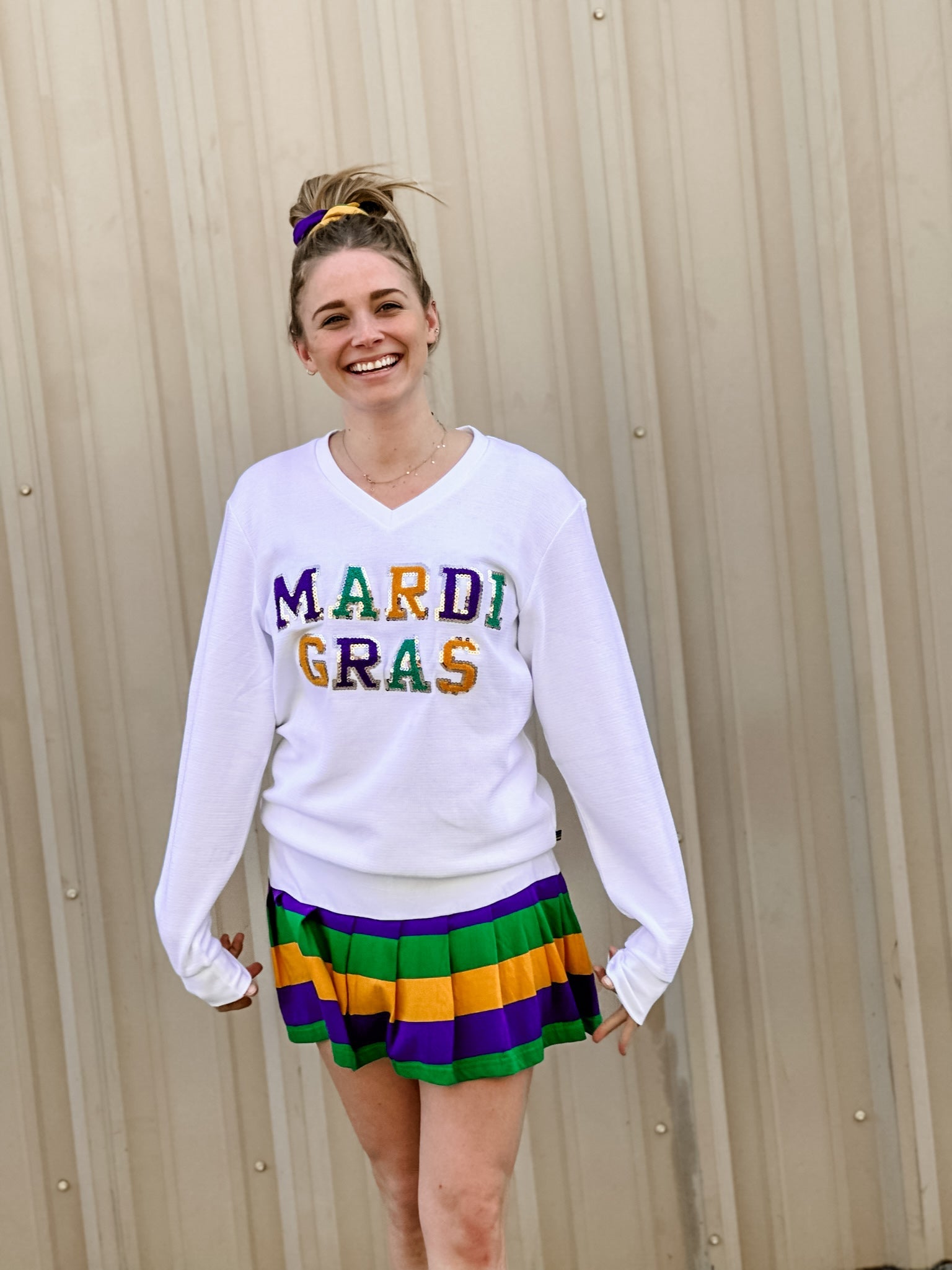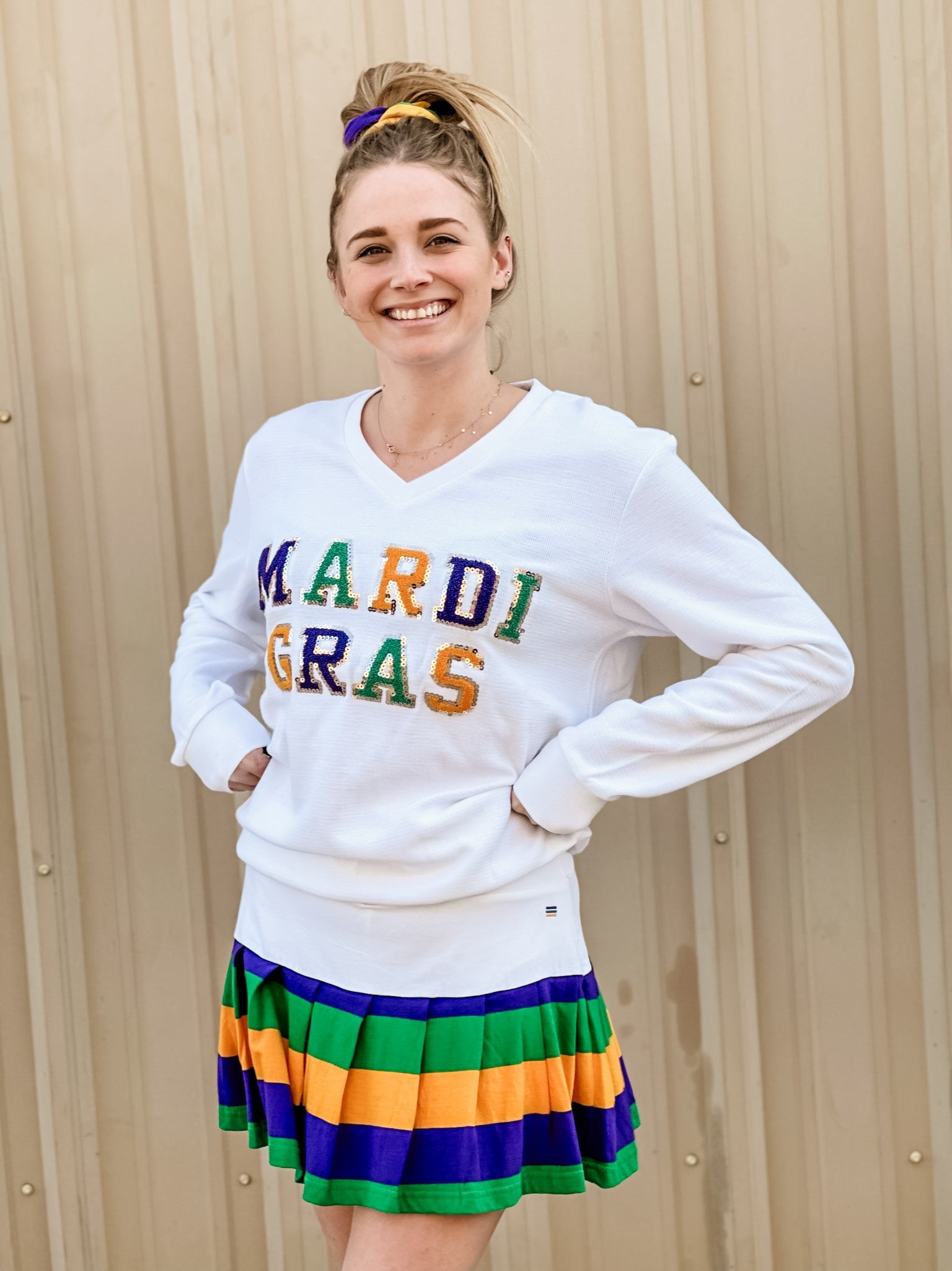 Give your preppy wardrobe a fun Mardi Gras makeover with this sparkling sequin V-neck. Featuring traditional purple, green, and gold accents, pair it with one of our Mardi Gras skorts for an outfit that's sure to stand out! And of course don't forget to Laissez les bons temps rouler!
