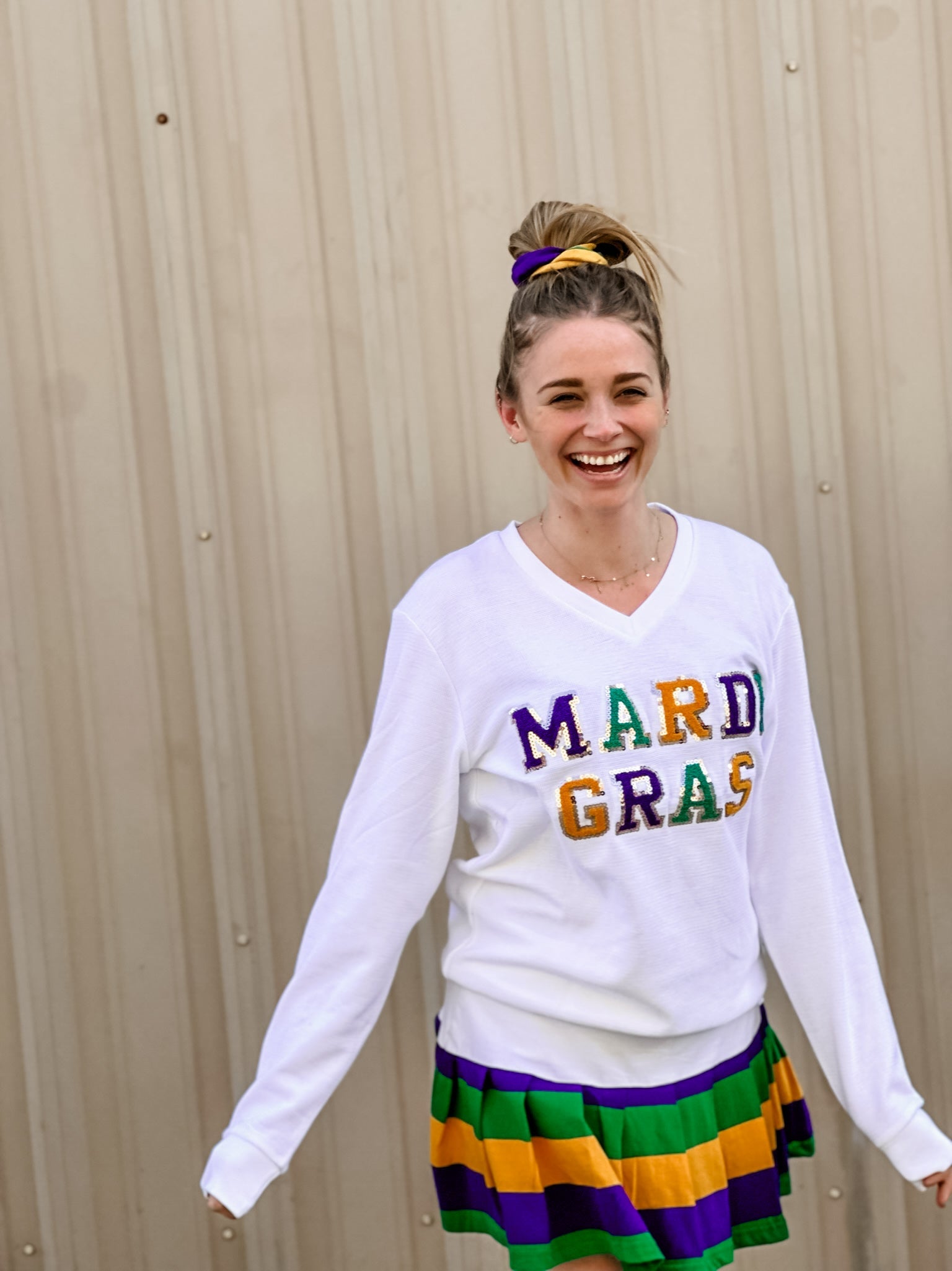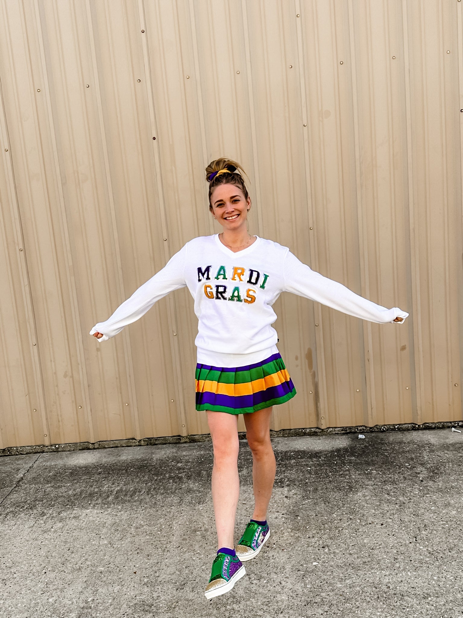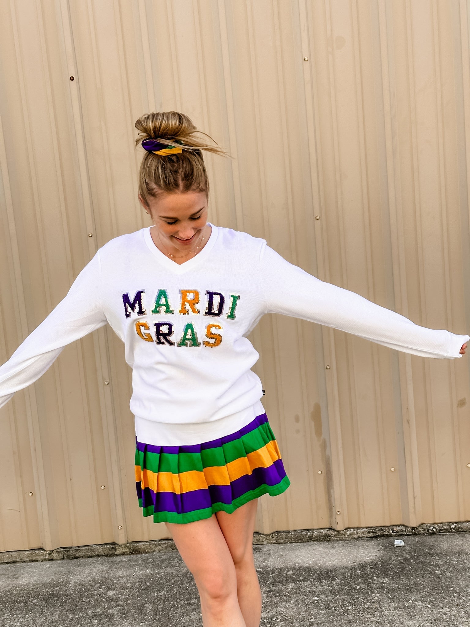 Give your preppy wardrobe a fun Mardi Gras makeover with this sparkling sequin V-neck. Featuring traditional purple, green, and gold accents, pair it with one of our Mardi Gras skorts for an outfit that's sure to stand out! And of course don't forget to Laissez les bons temps rouler!