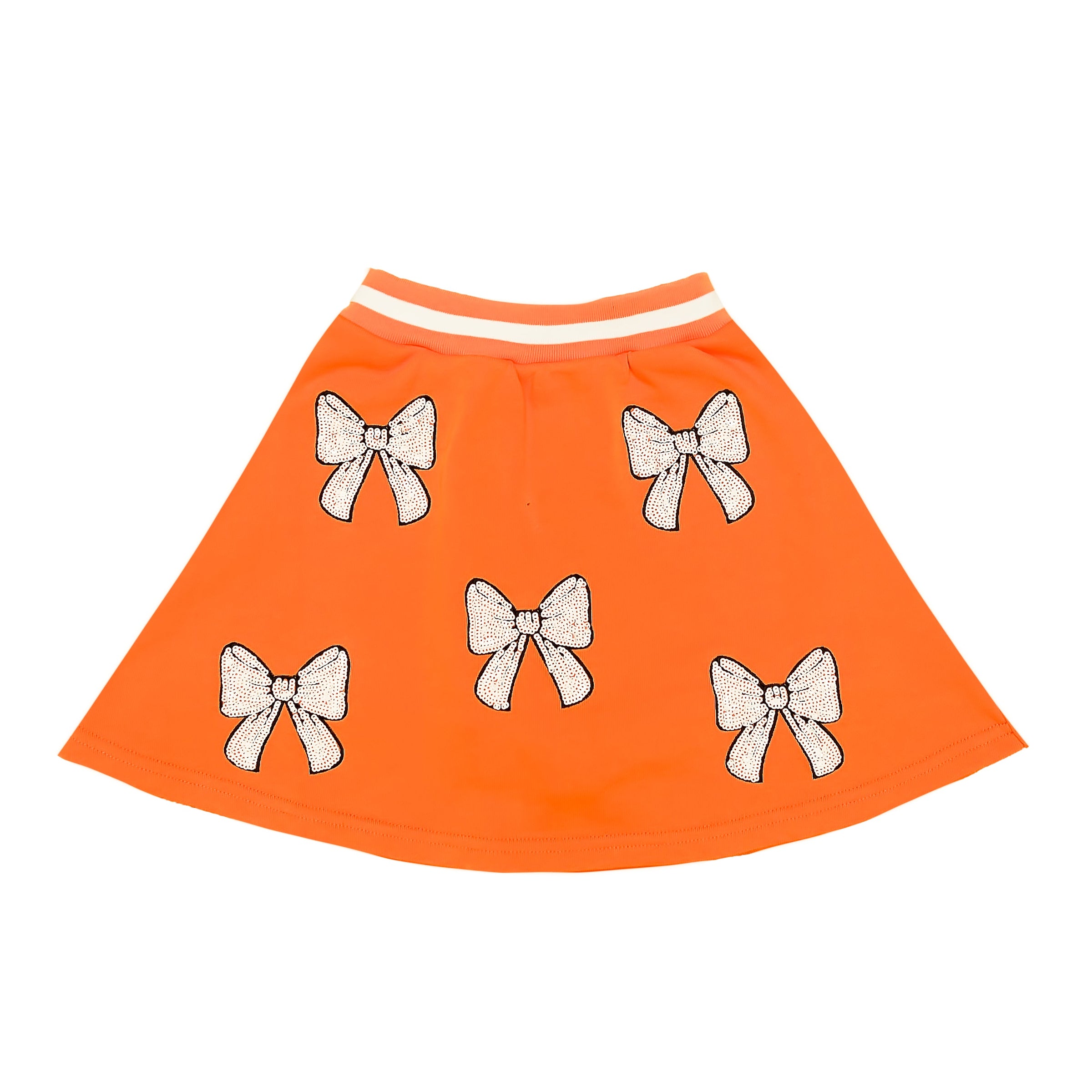 Add a touch of sparkle to game day with this Bright Orange and White Bows Skort! Featuring playful sequin bows, it pairs perfectly with the matching top for a coordinated, fun look. Comfortable and stylish, it’s the perfect choice to cheer on your team in girly, glittery style.