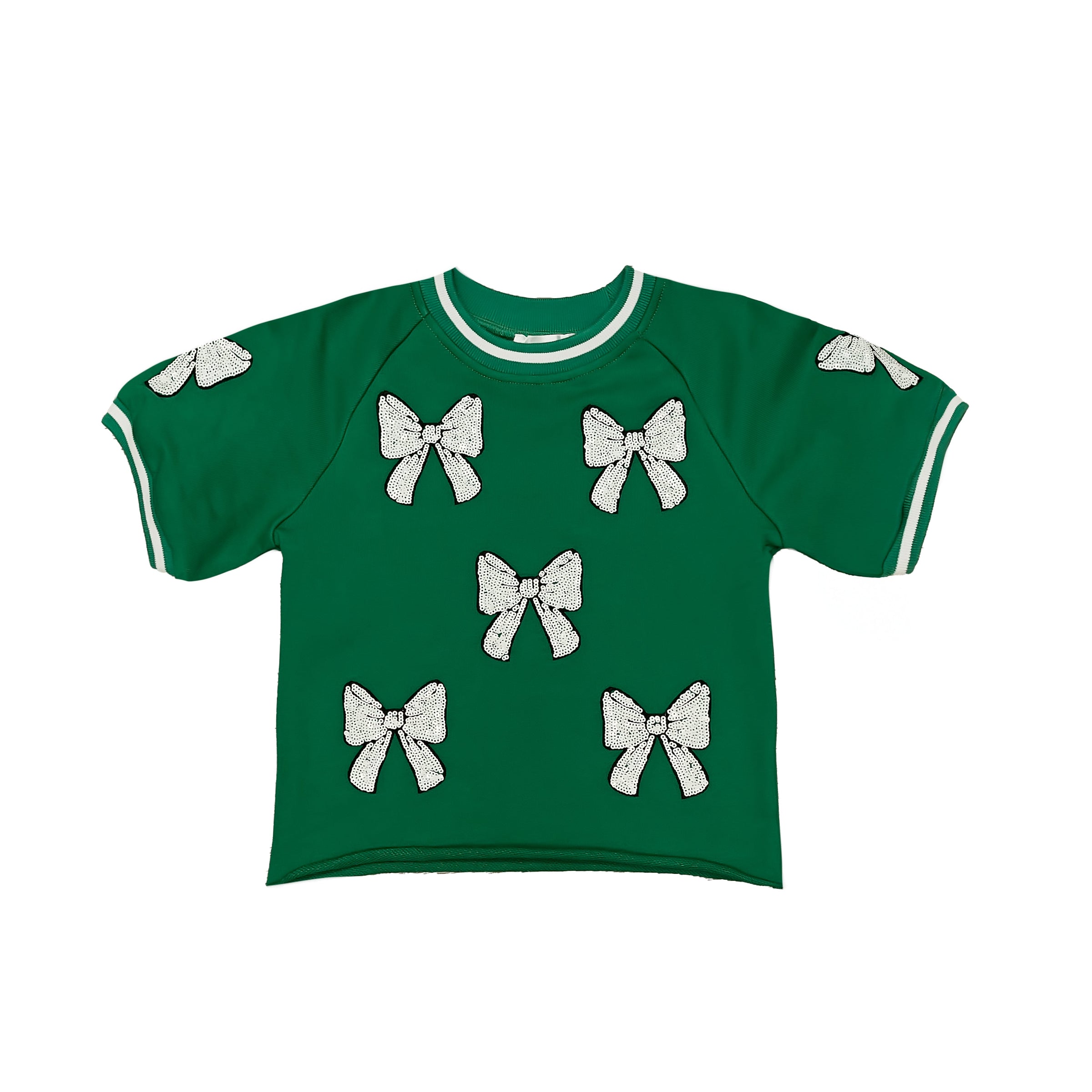 Get game day ready with our Green and White Bows Top, featuring playful sequin bows that add a fun, girly sparkle to your look. Perfect for showing team spirit with a touch of glam, this top combines comfort and style for your best cheer yet. Pair with the matching skort for a complete look!