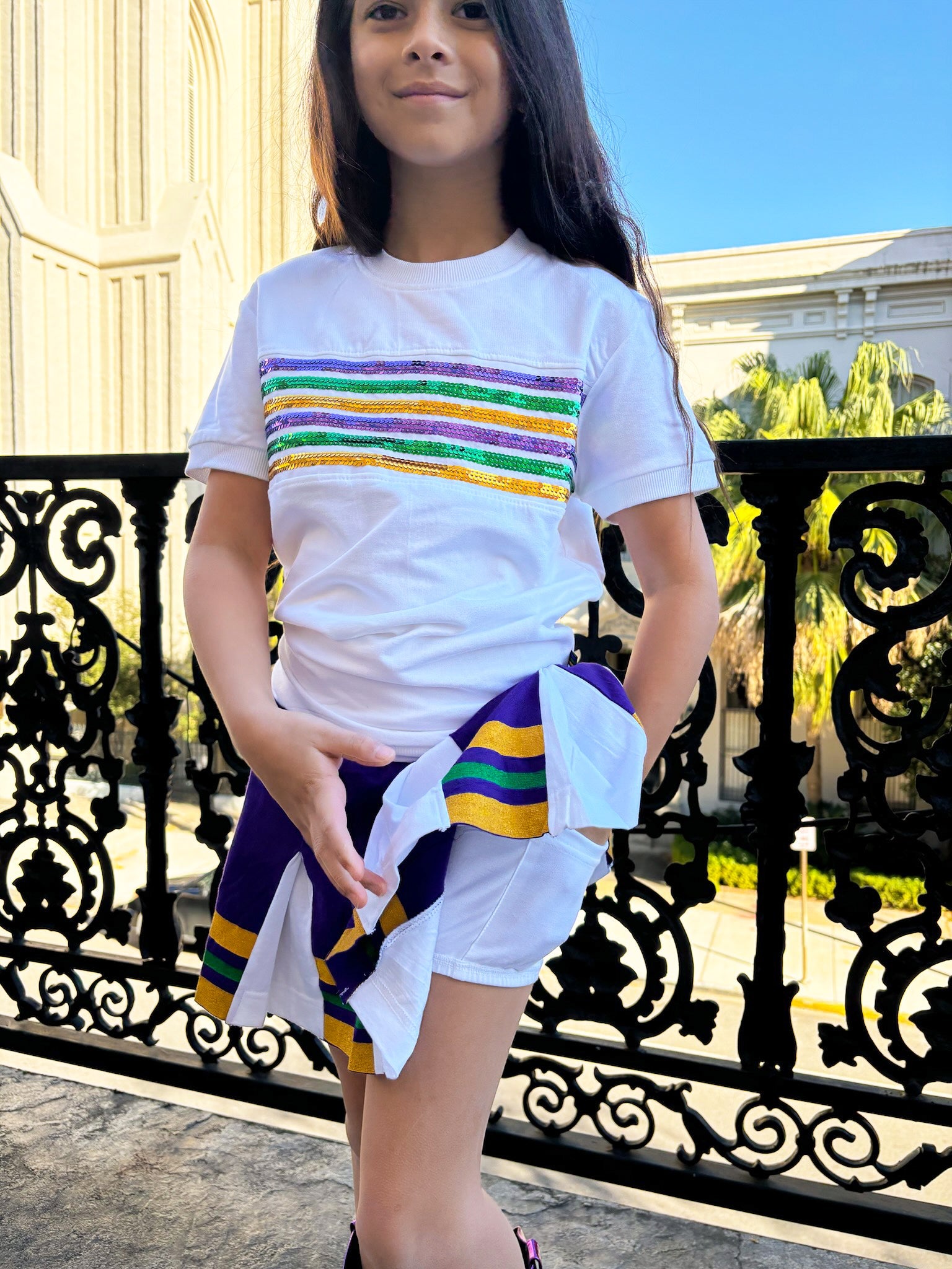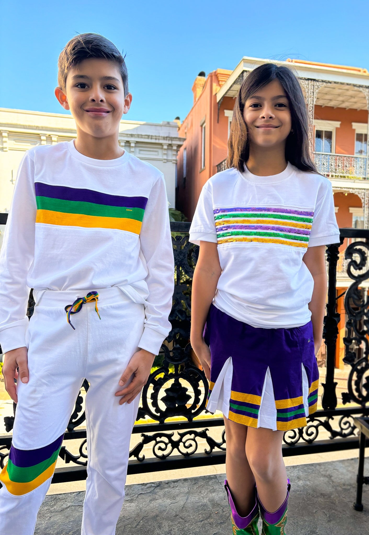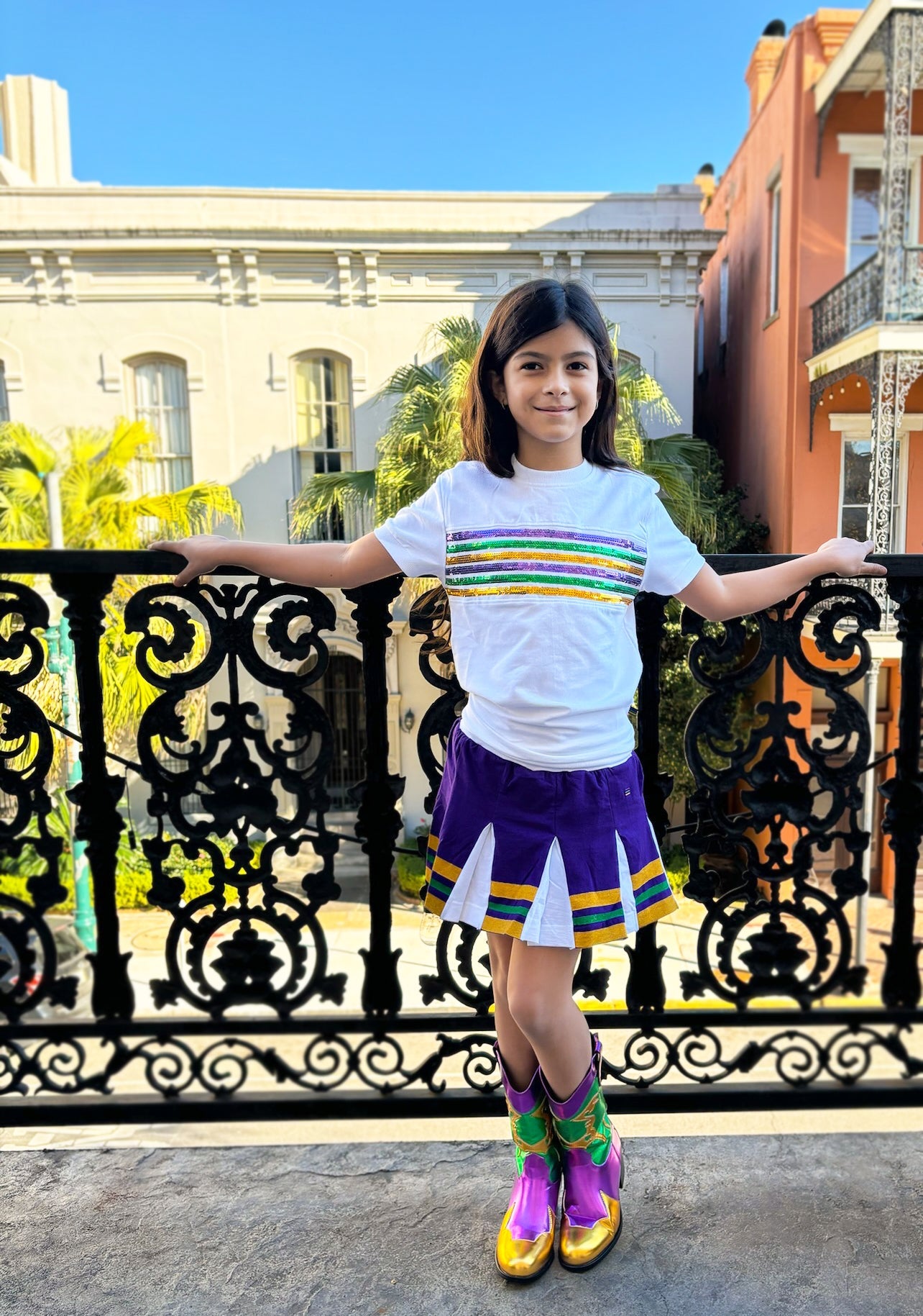 Score big style points with our Junior Knife Pleat Skort in festive Mardi Gras colors! This cheer style skort features a playful purple base with eye-catching green and gold stripes. Perfect for showing off your fun and quirky spirit on the field or on the sidelines!