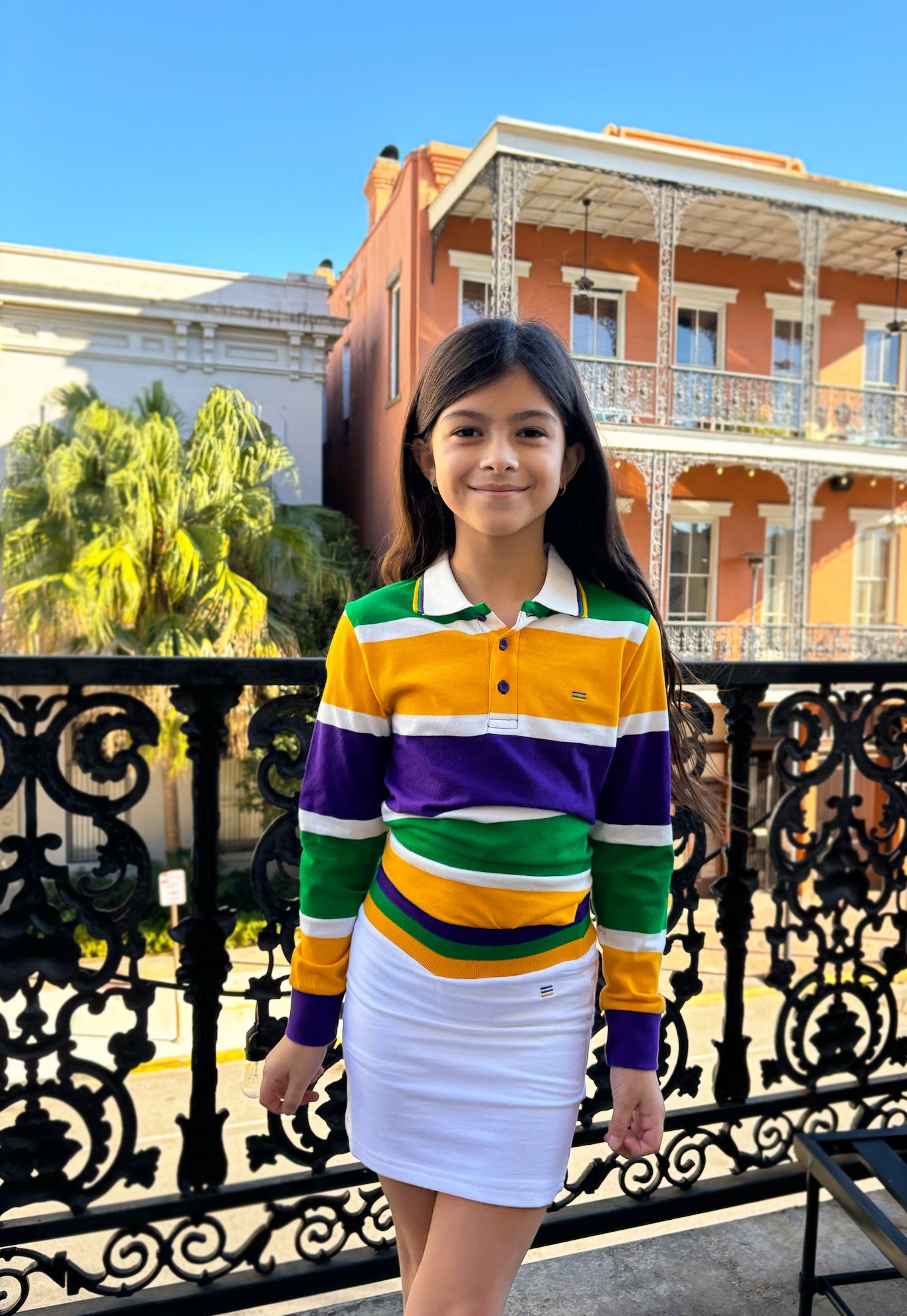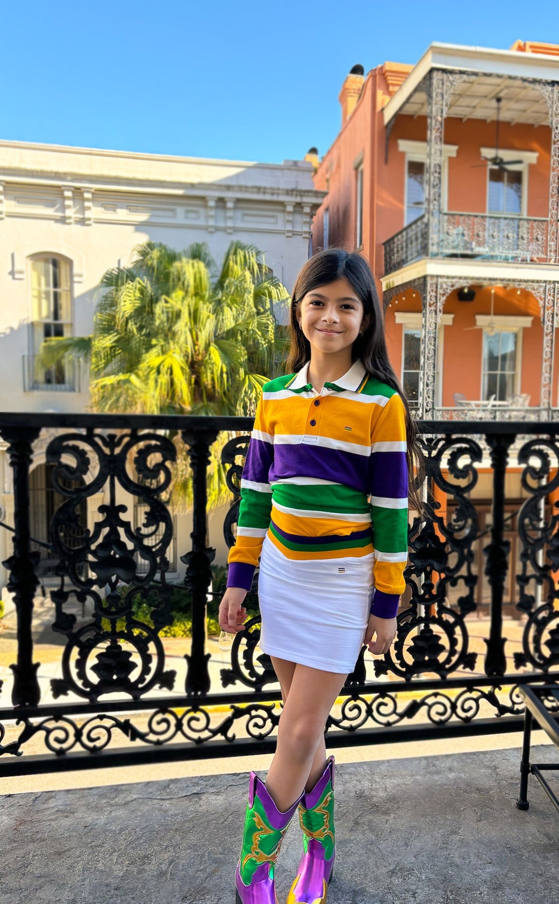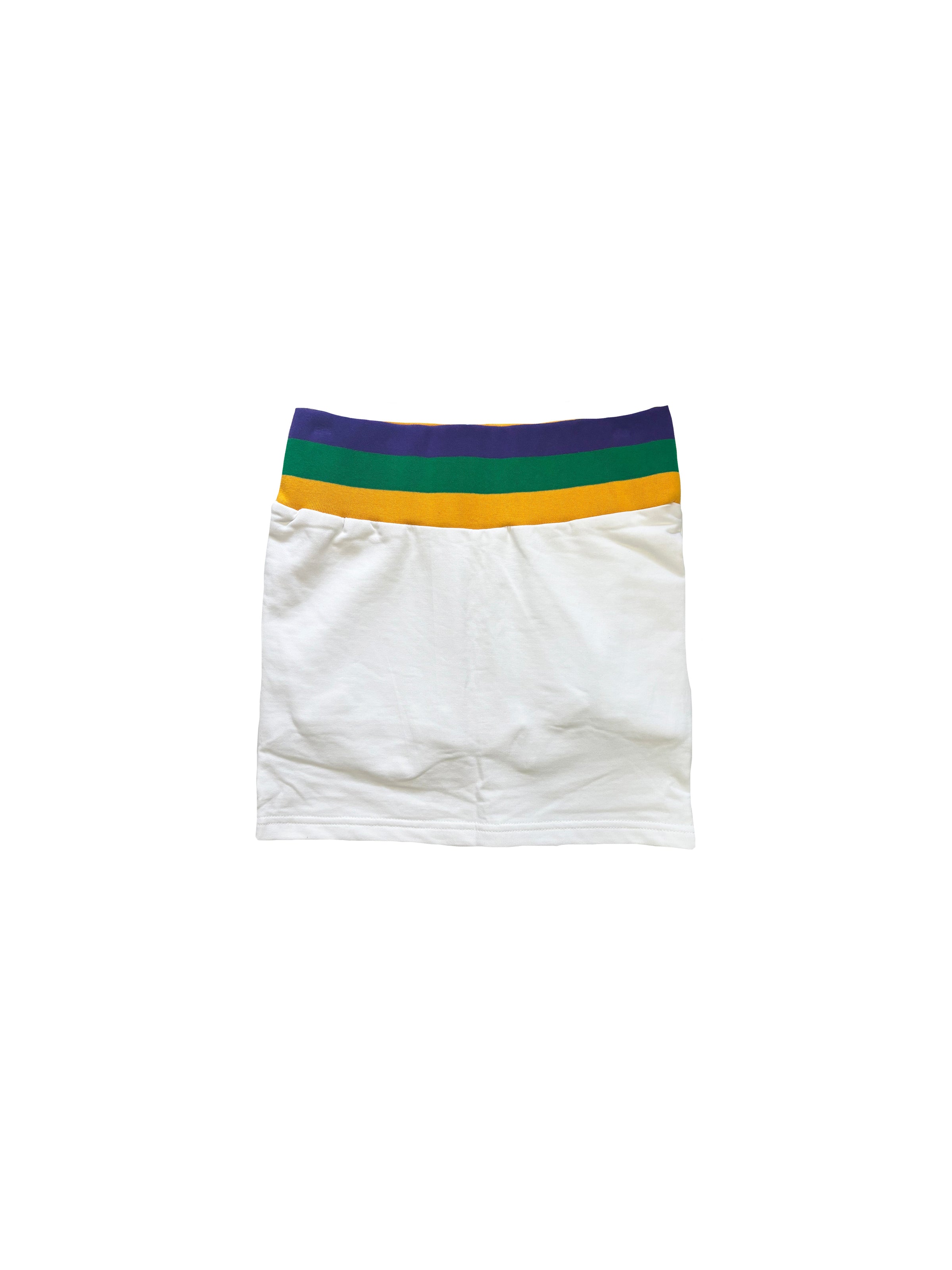 Party in style with our Junior Straight Cut Skort in White! Perfect for Mardi Gras, this skort features pockets and a colorful purple, green, and gold waistband. Let loose and show off your playful side with this fun and functional skort.
