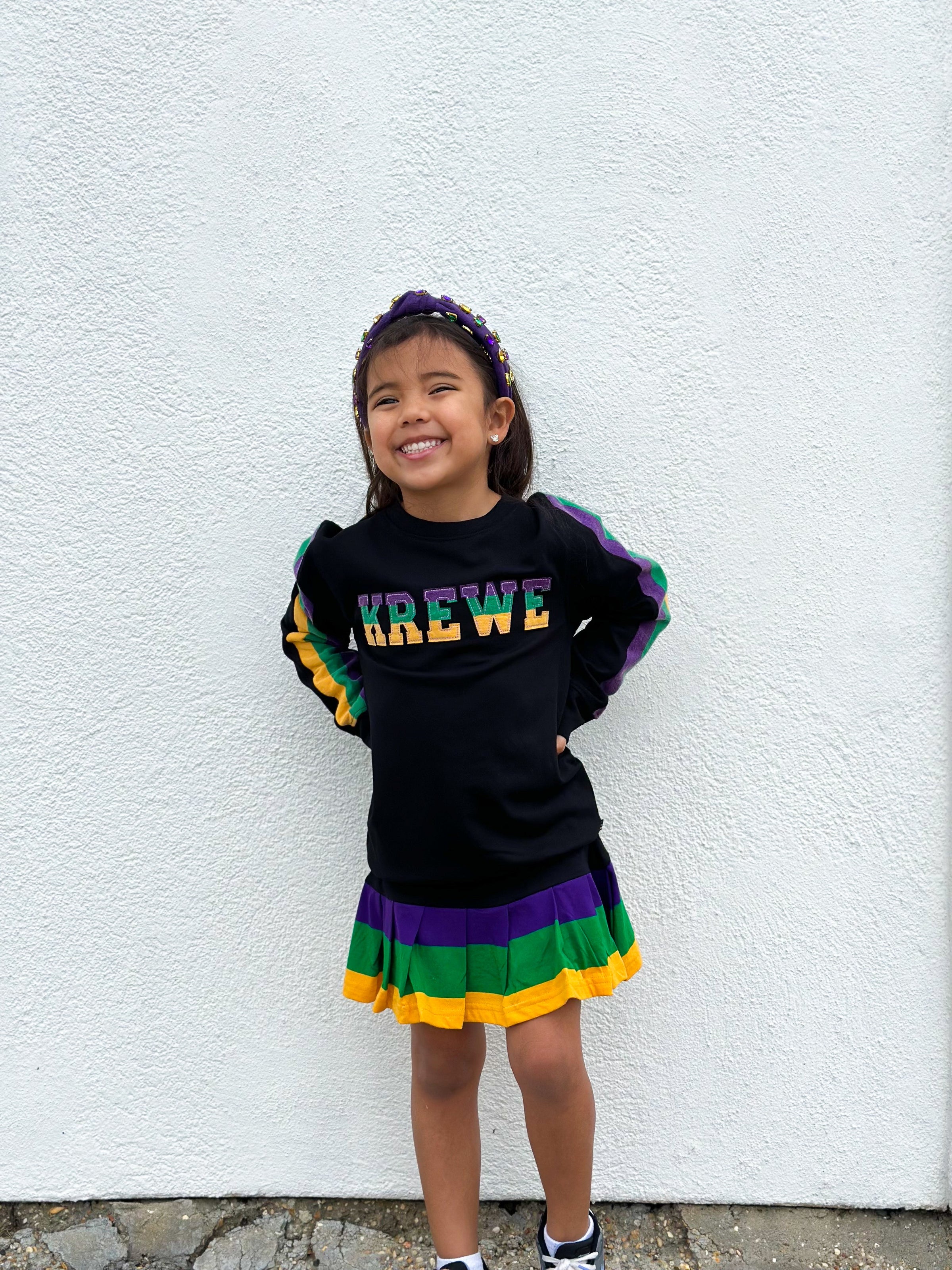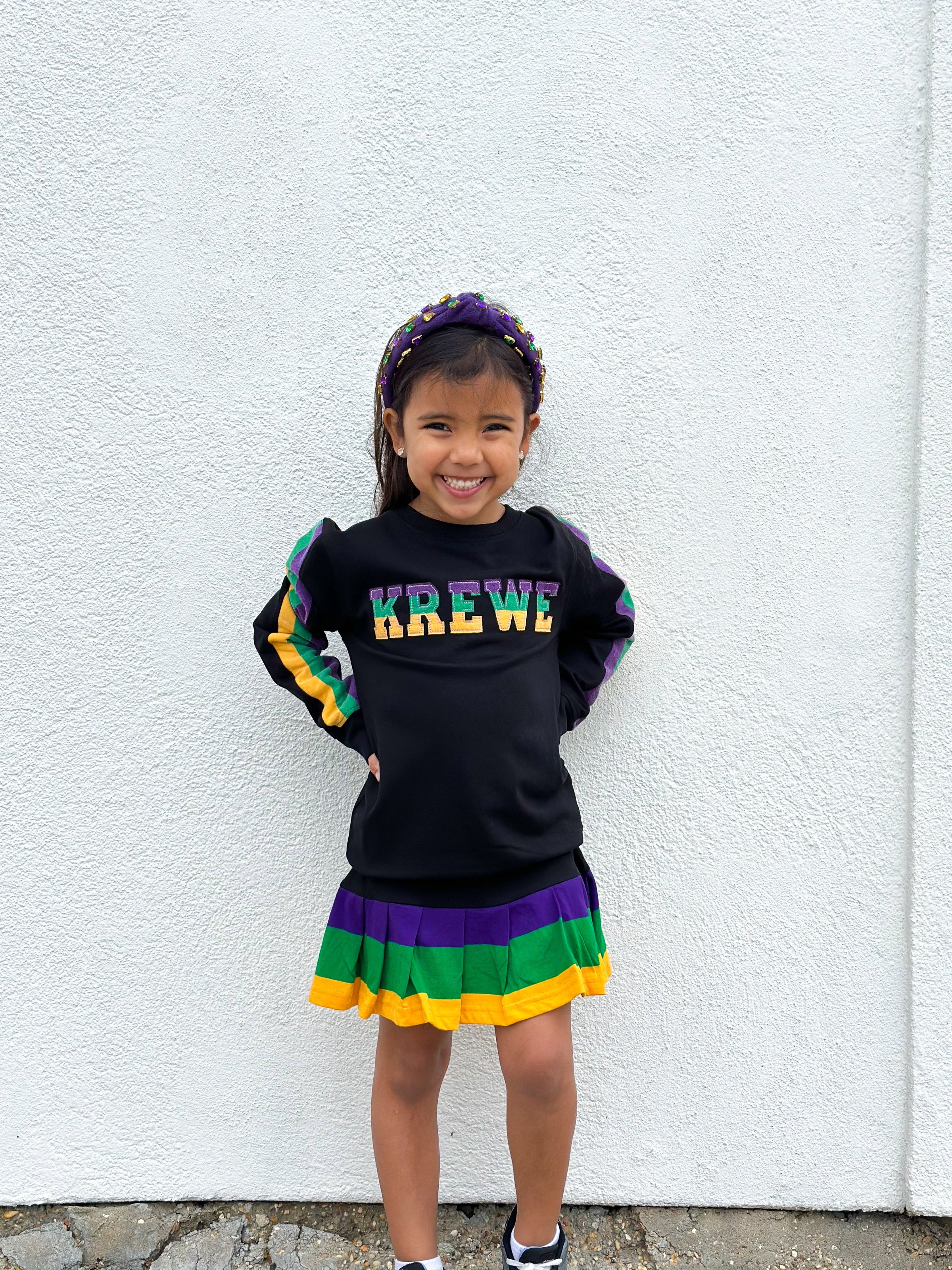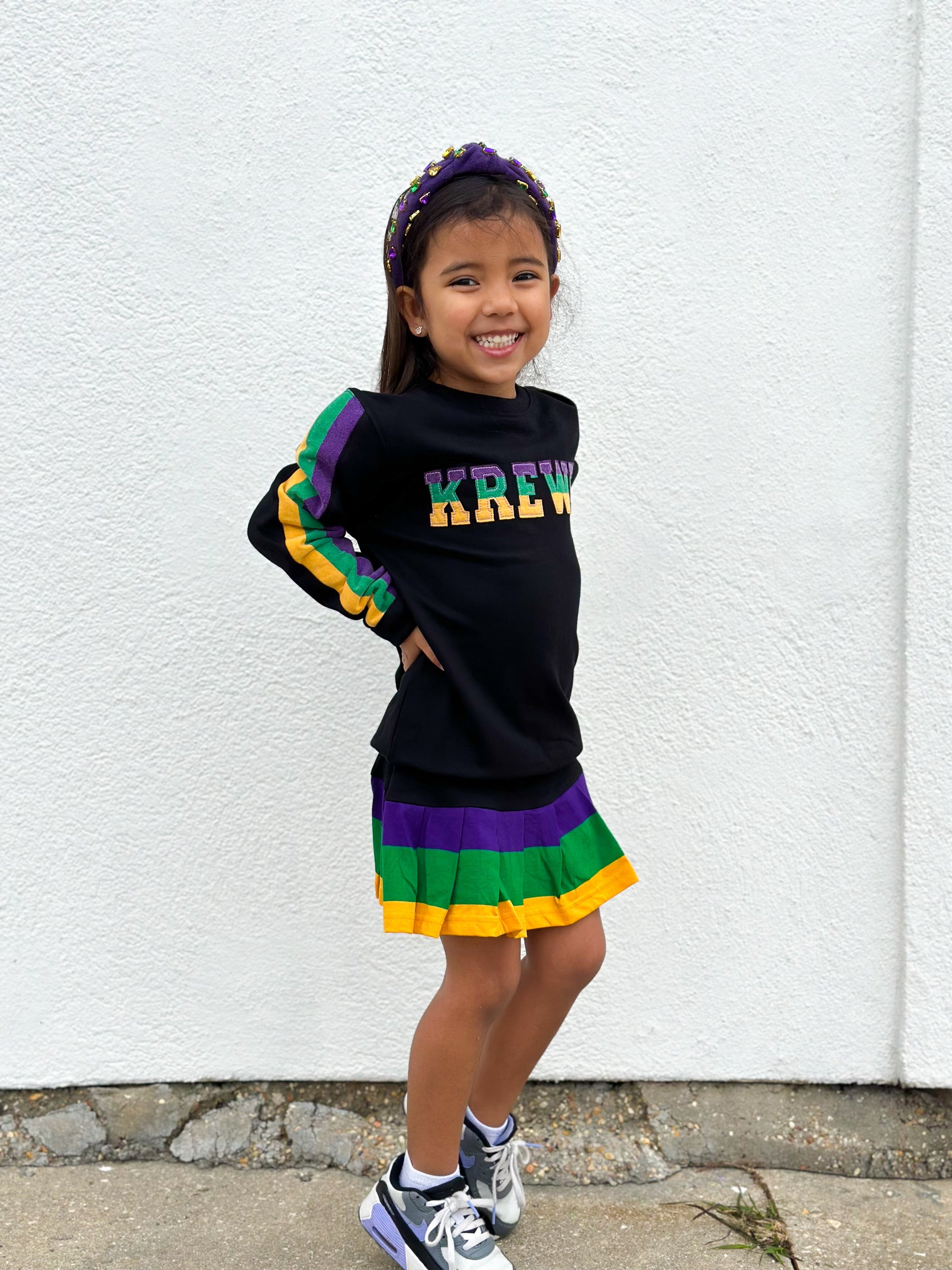 Look cute and stay cool with our Pleated Youth Skorts in Black! Perfect for effortless Mardi Gras style, this pleated skort features purple, green, and gold stripes that give off major preppy vibes. Get it now and be the life of the party. 🎉