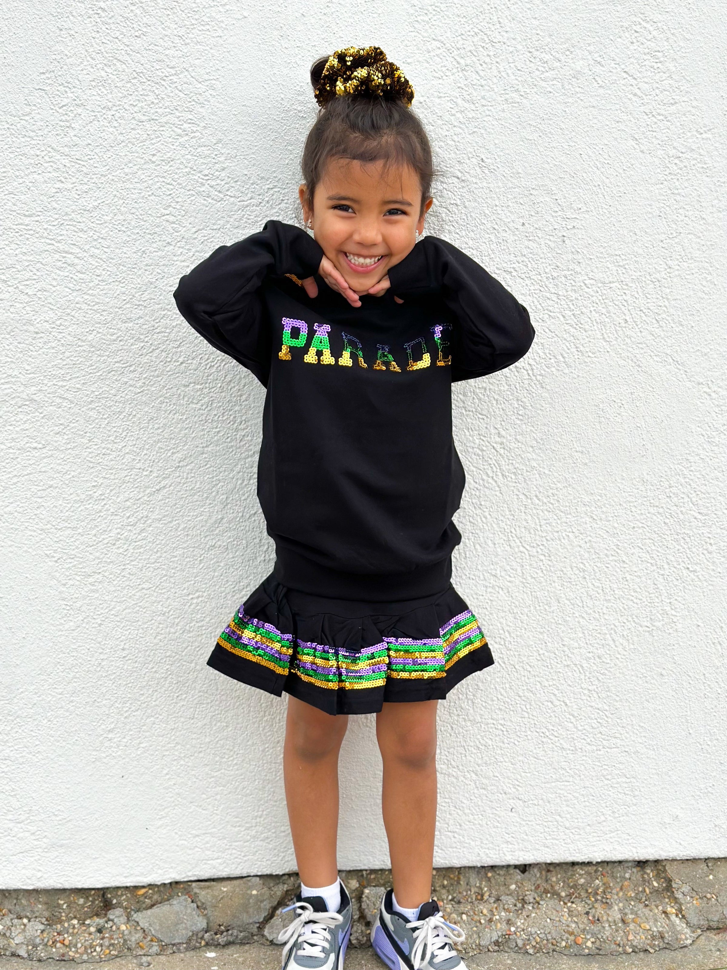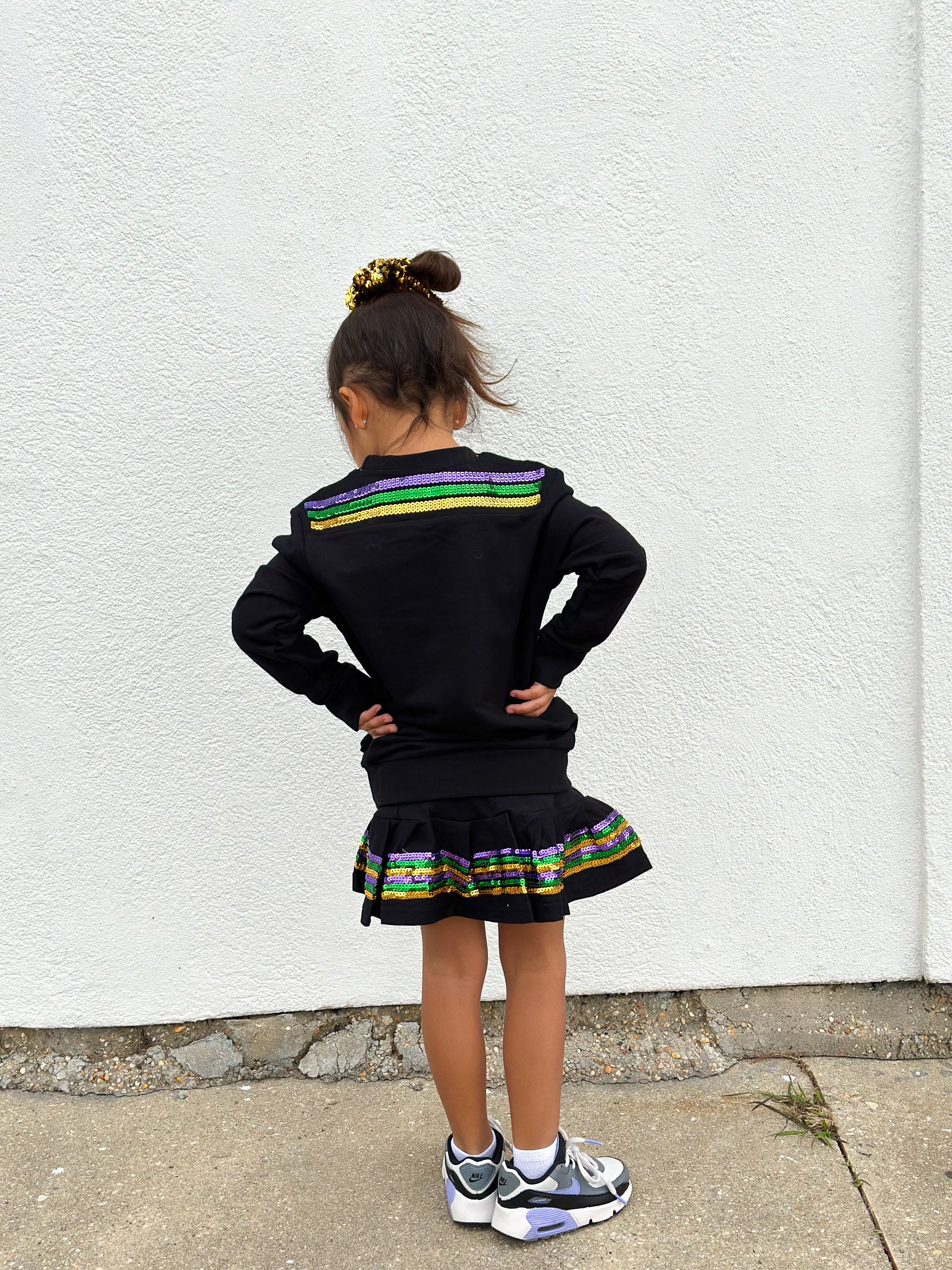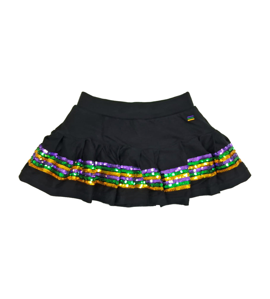 Shine bright like a (disco) ball in these Youth Sequin Skorts in Black! With Mardi Gras-worthy purple, green, and gold sequin stripes, you'll be the center of attention wherever you go! Perfect for pickleball, parades, and more, you can't go wrong!