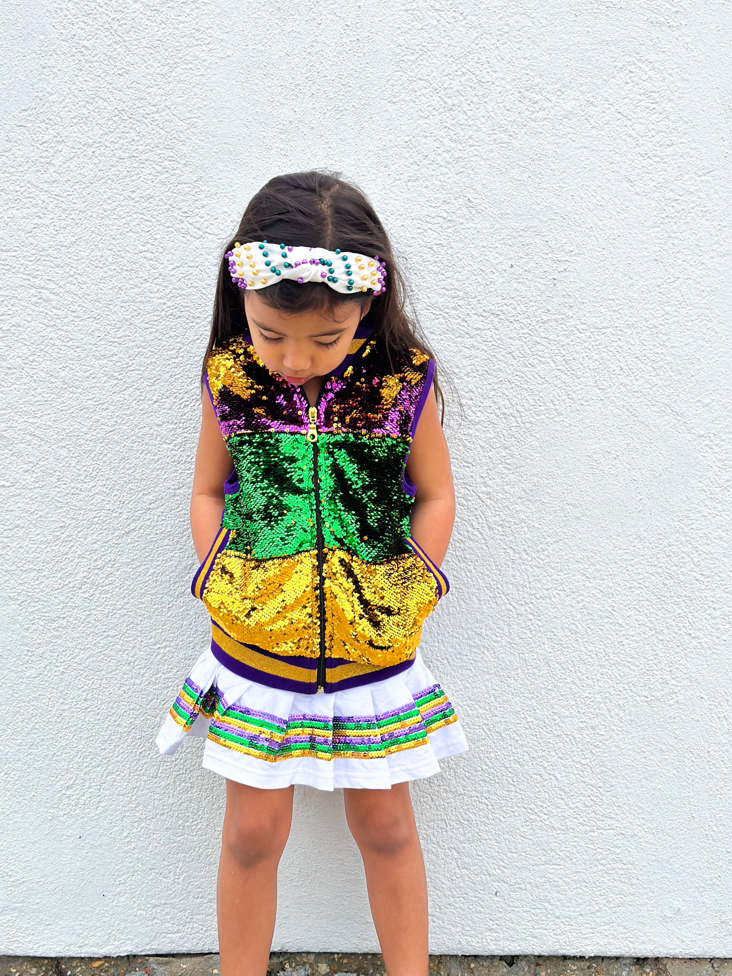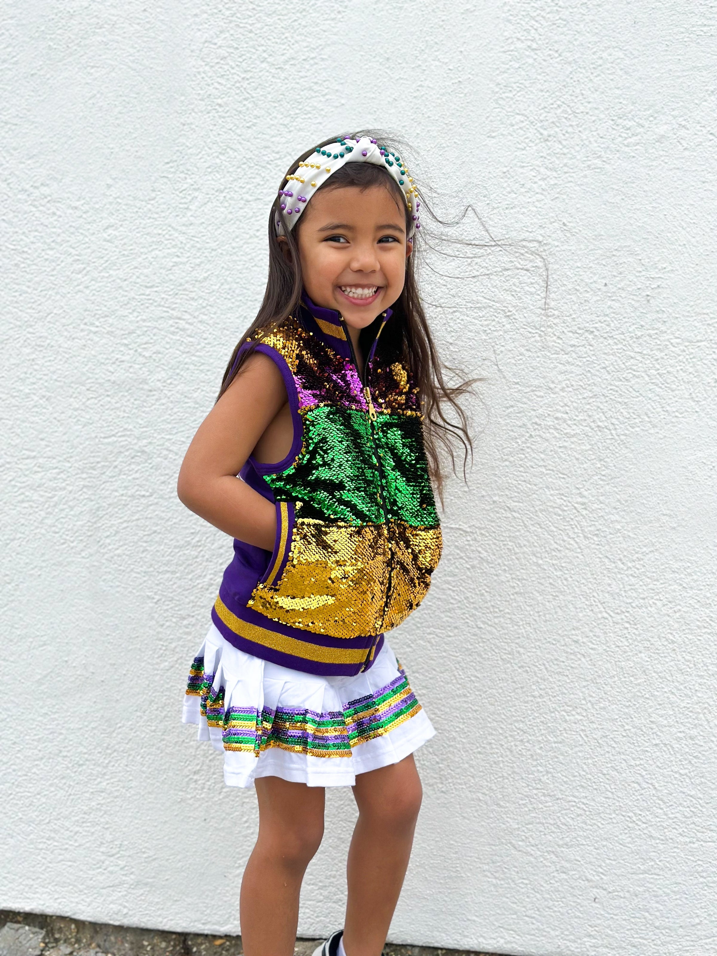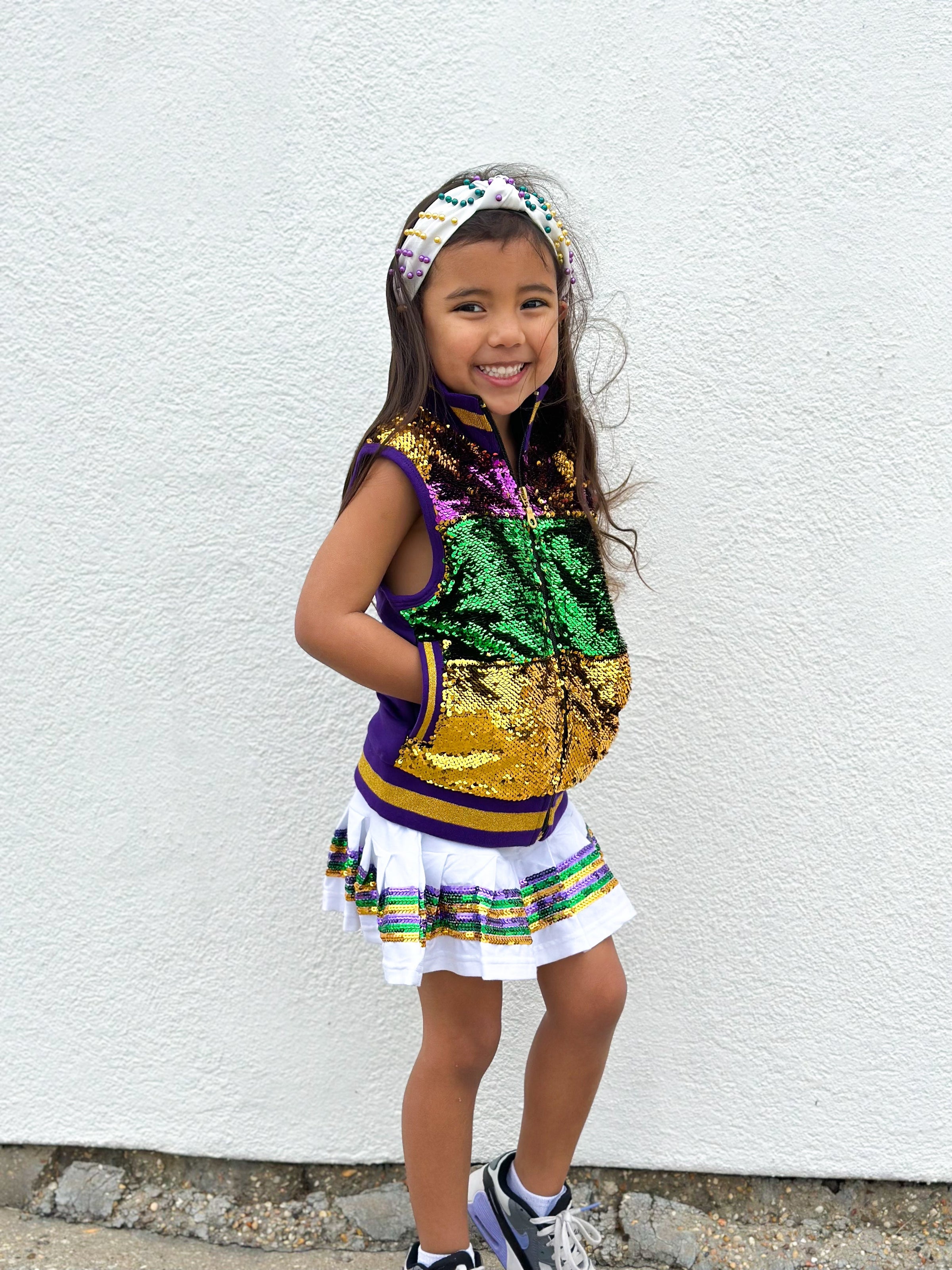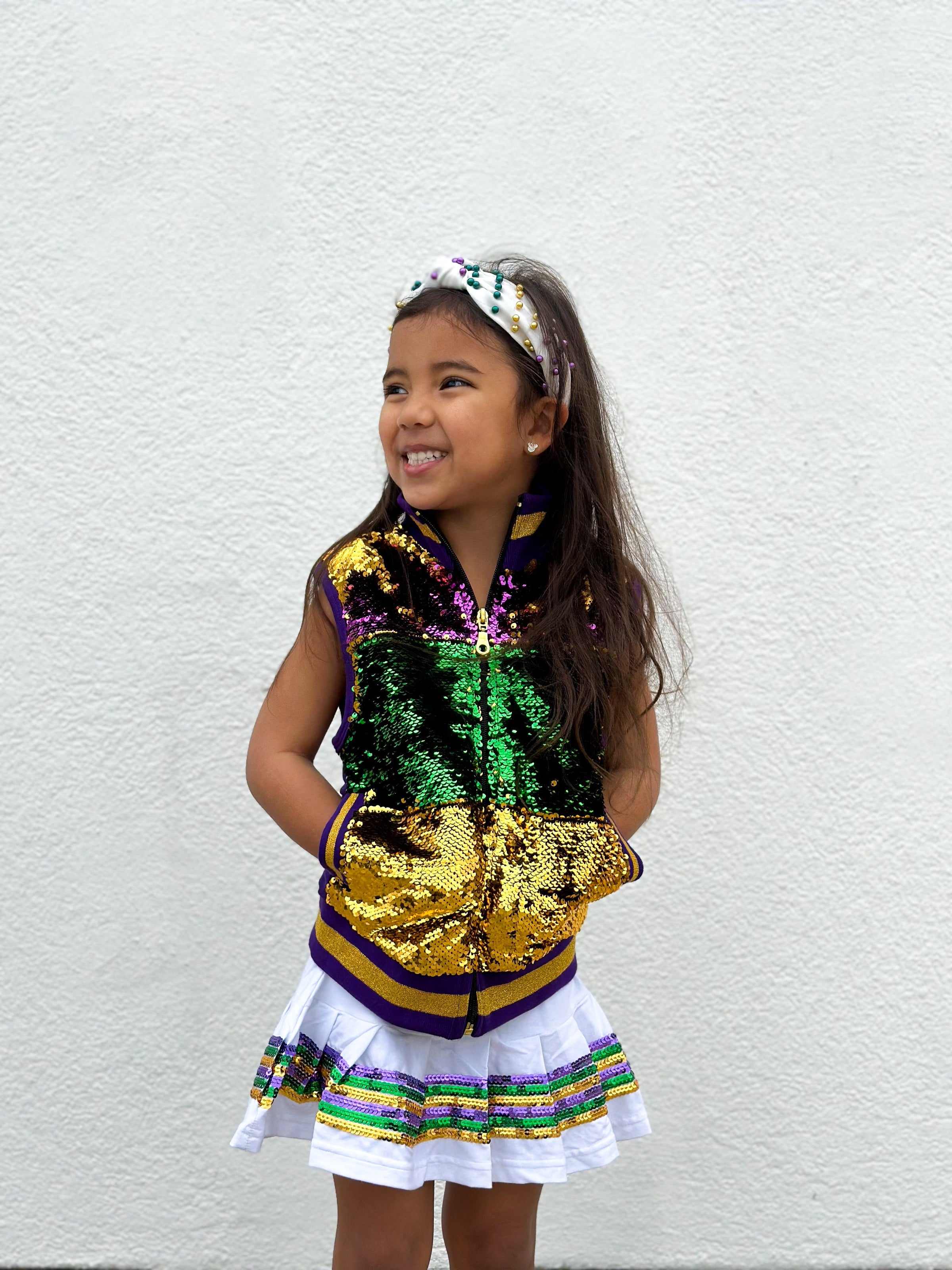 Shine bright like a (disco) ball in these Youth Sequin Skorts in White! With Mardi Gras-worthy purple, green, and gold sequin stripes, you'll be the center of attention wherever you go! Perfect for pickleball, parades, and more, you can't go wrong!