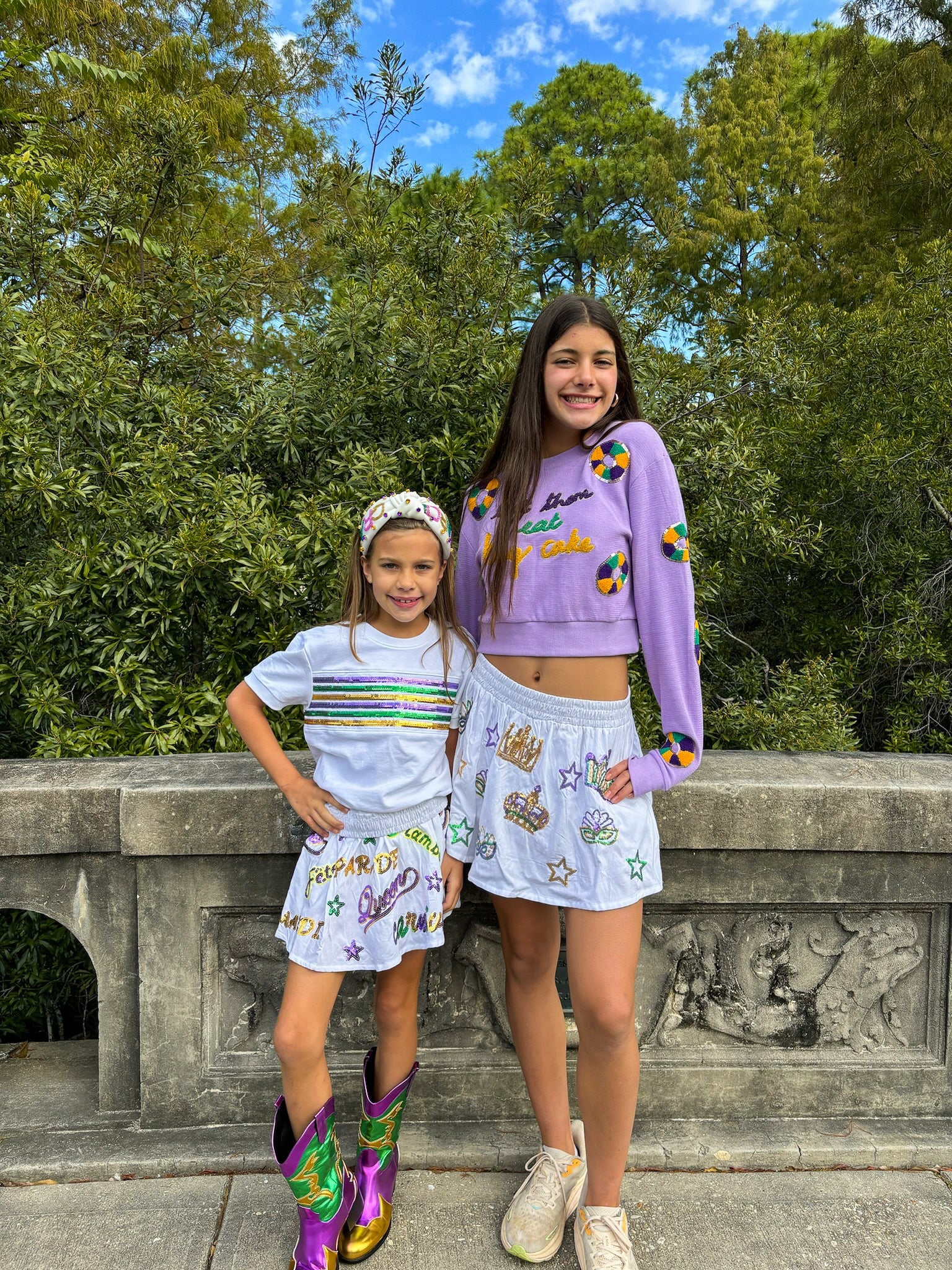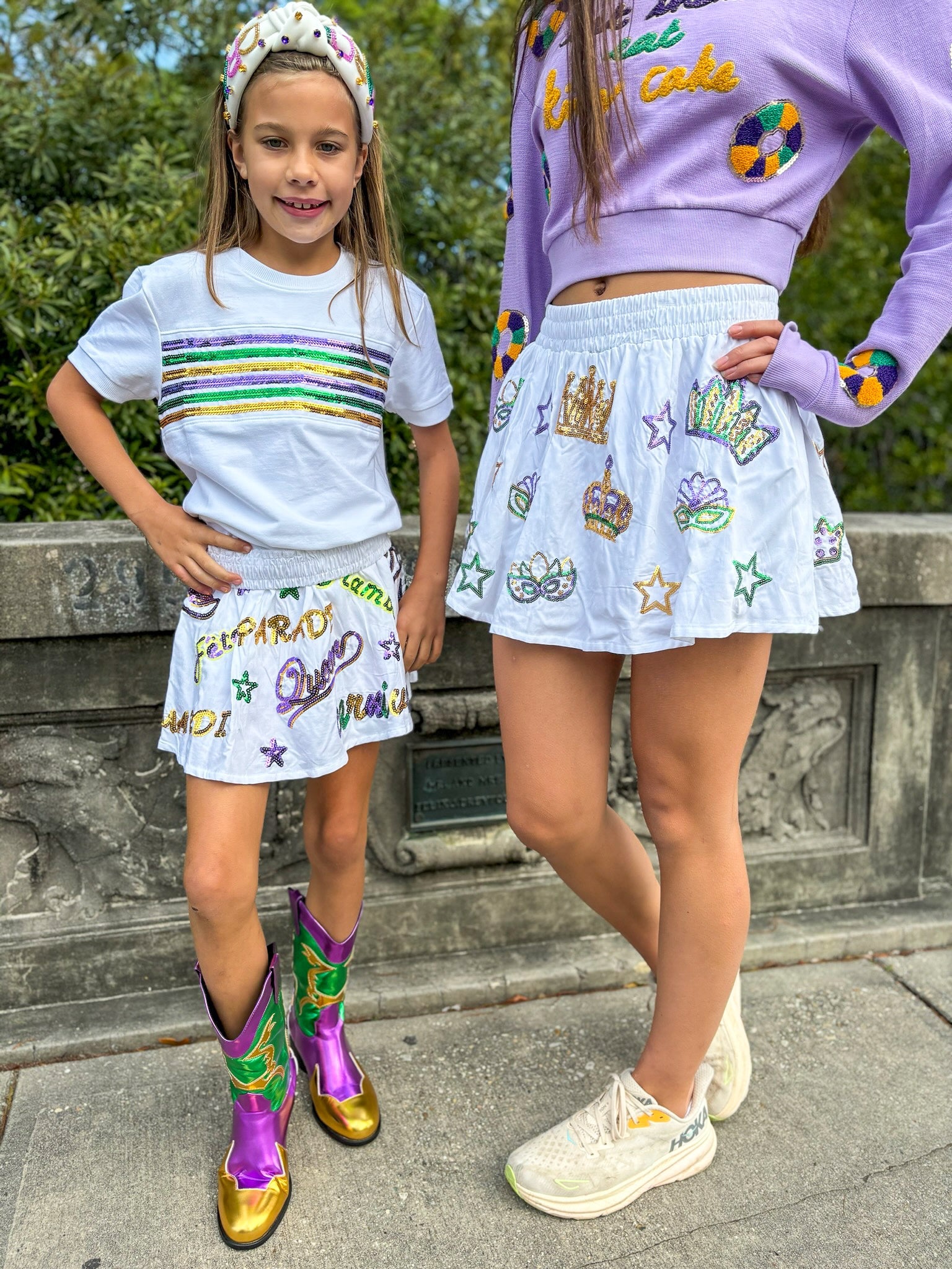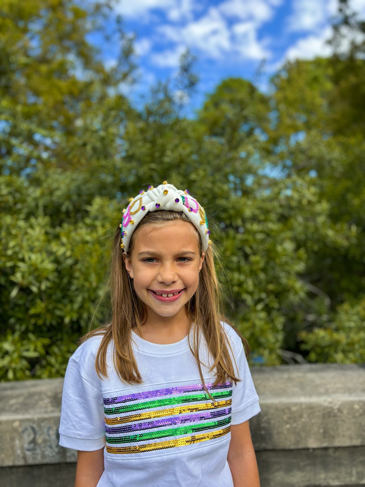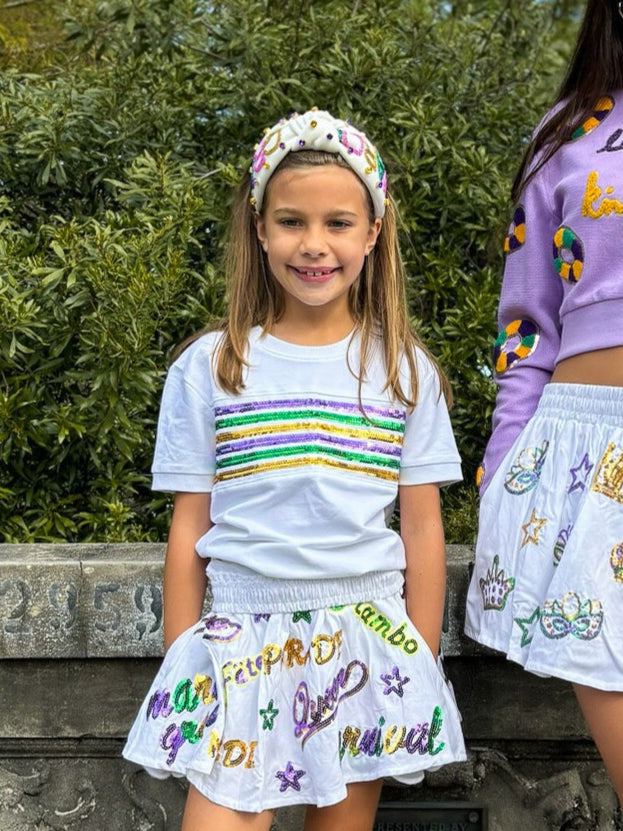 Celebrate the carnival spirit with this Youth Sequin Stripe French Terry Short Sleeve Shirt! Adorned with purple, green, and gold sequin stripes, this shirt is perfect for Mardi Gras. Pair it with jeans for a casual look or up the fun factor with metallic leggings or a skort. Let the festivities begin!
